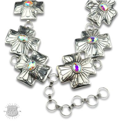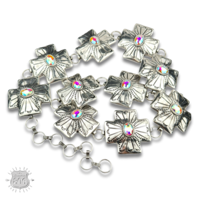 This western style belt has carved look large square cross conchos with a large AB oval rhinestone center. The conchos are linked together with large silver tone rings. There is an extender chain to adjust for the waist and hips.