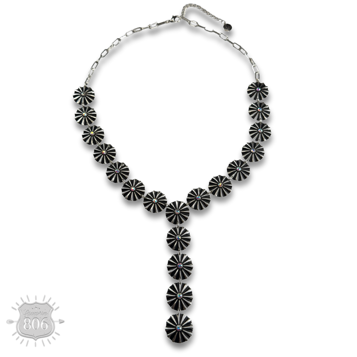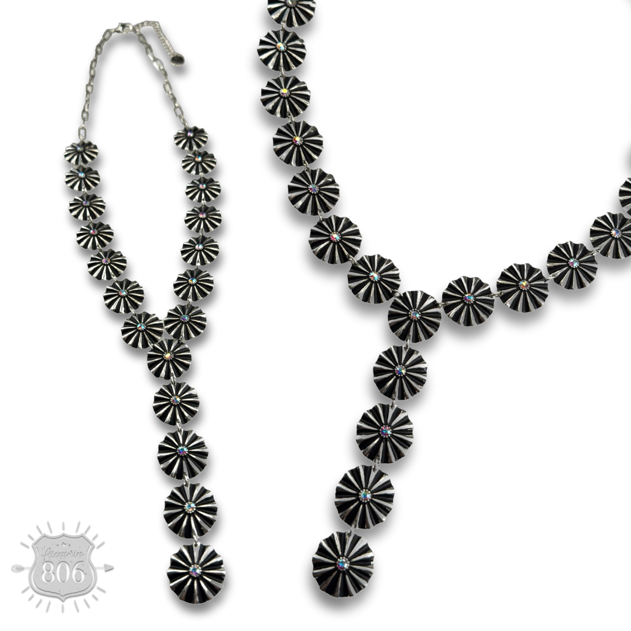 This Y necklace has silver tone starburst conchos linked and each one is highlighted with iridescent rhinestones.