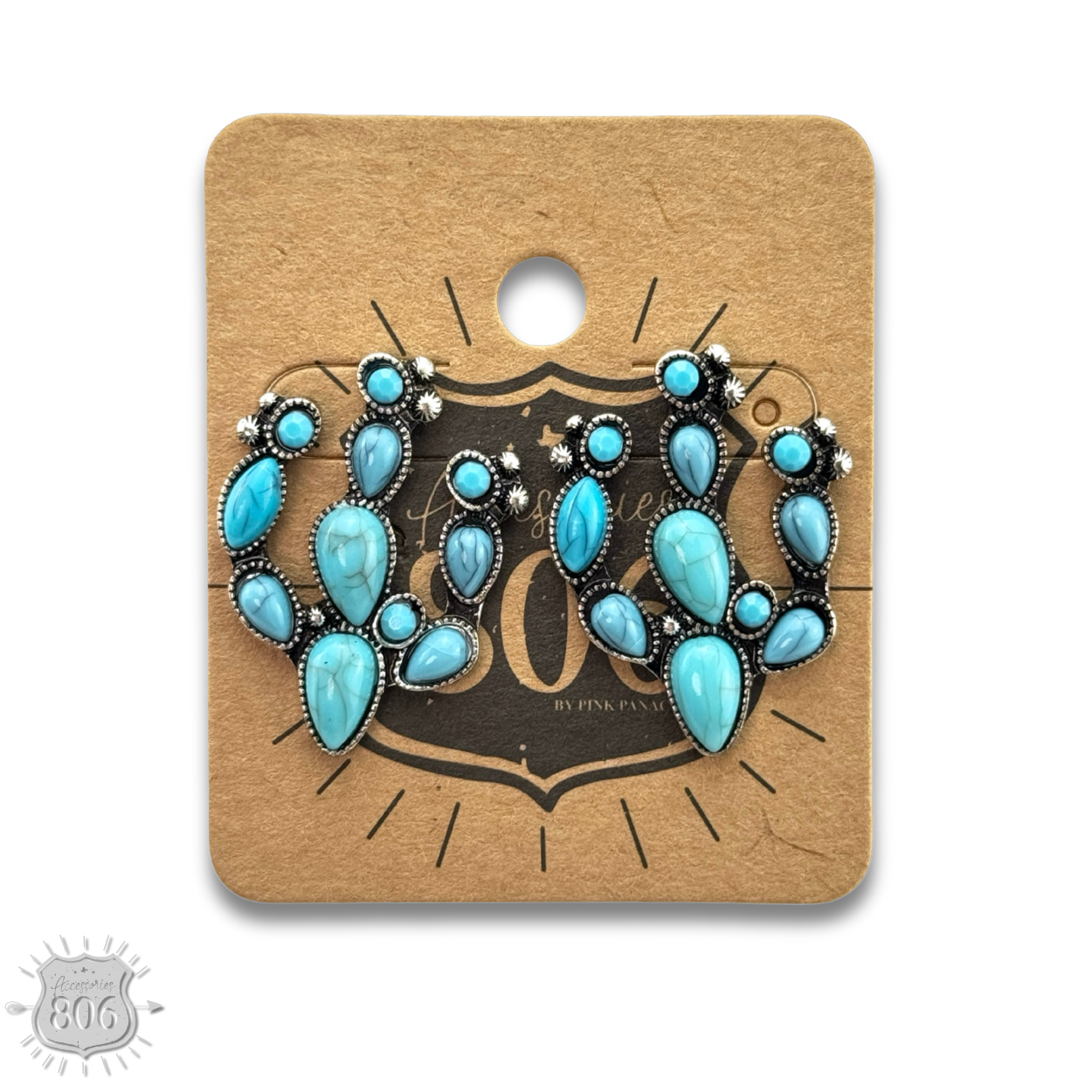 This earring, in the shape of a cactus, has turquoise color stone cabochons in the setting. It is worn as a post earring.