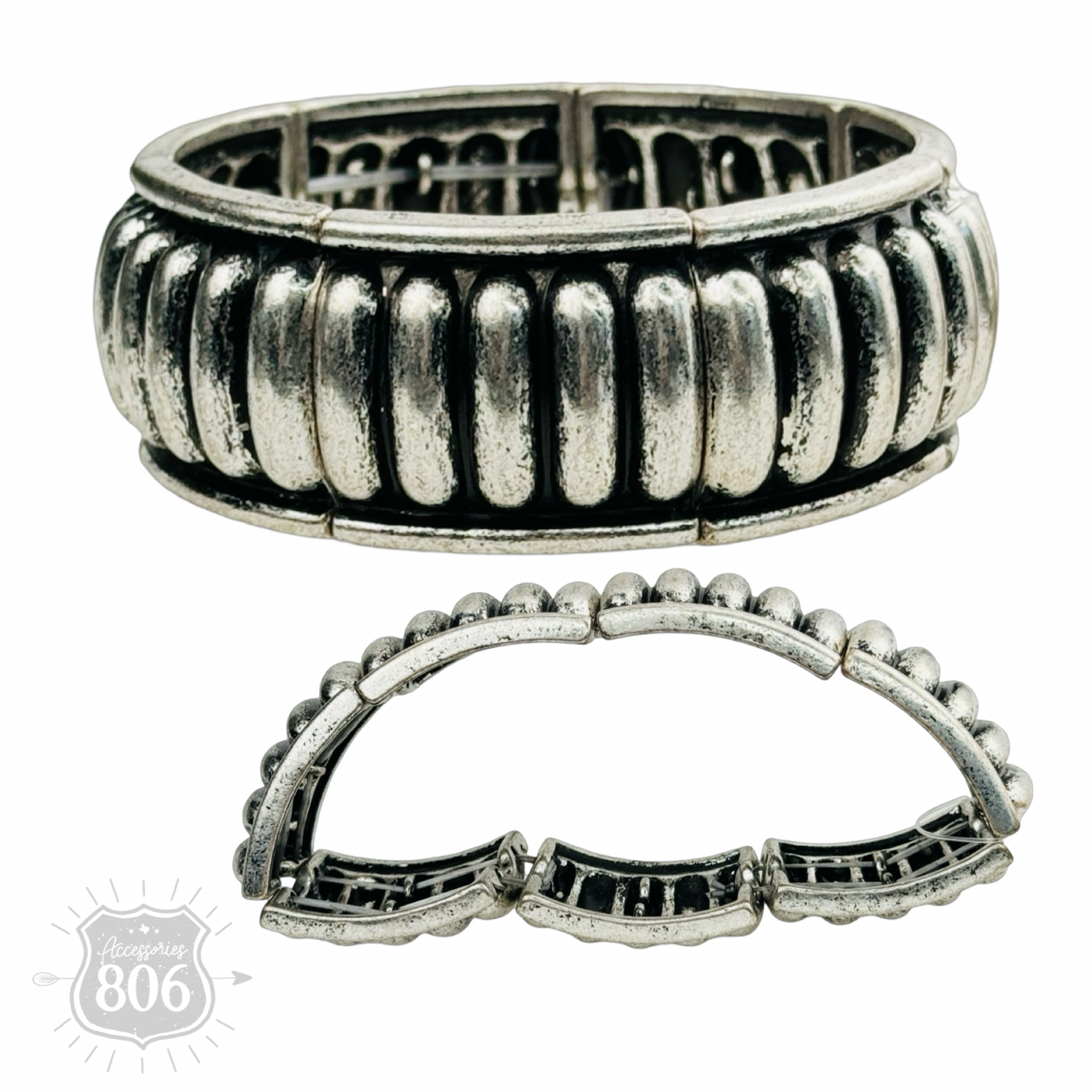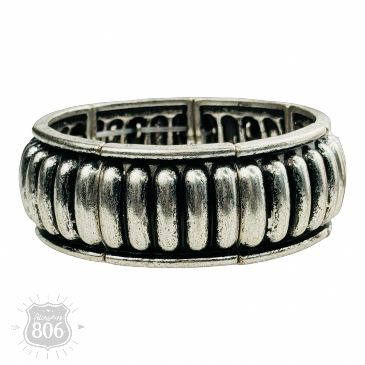 Western style bracelet cuff features burnished silver tone stamped look with raised center.