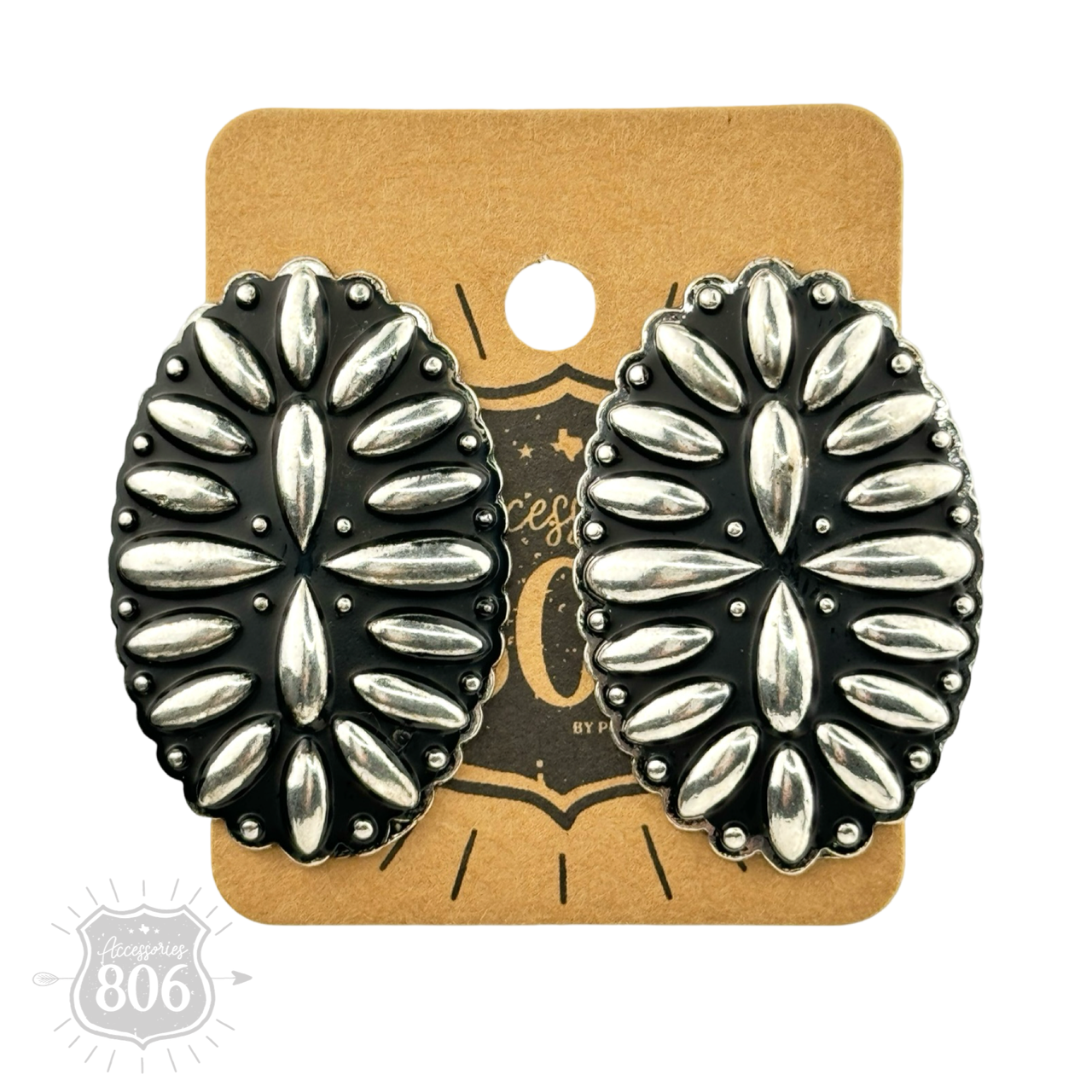 This western style silver tone carved look oval earring is dynamic and makes a statement. It is on a post setting.