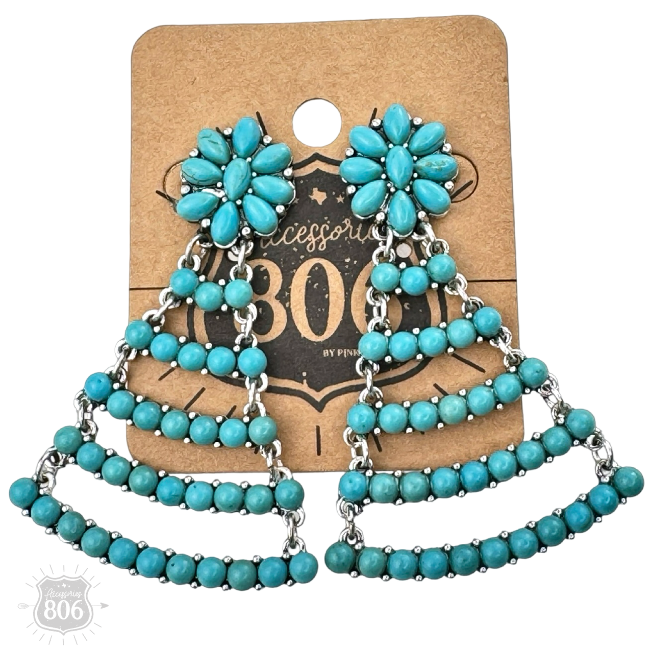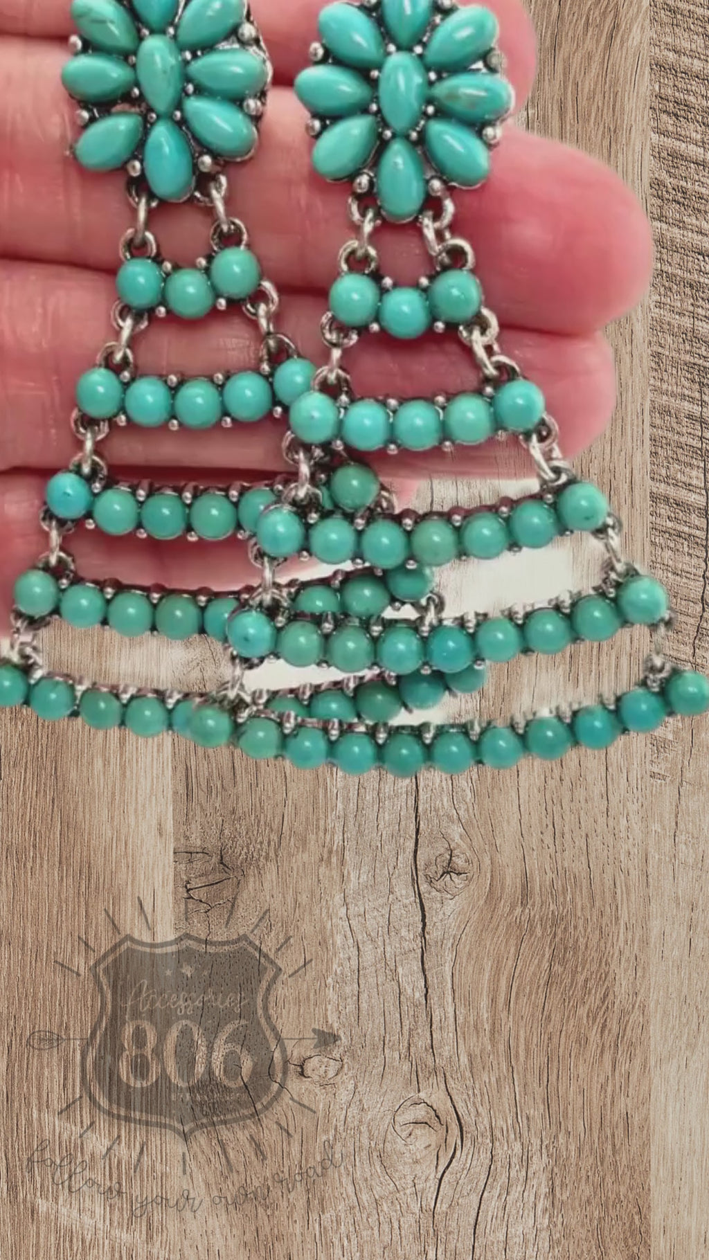 These earrings have turquoise color stones in a flower concho with a triangle shaped chandelier hanging below.