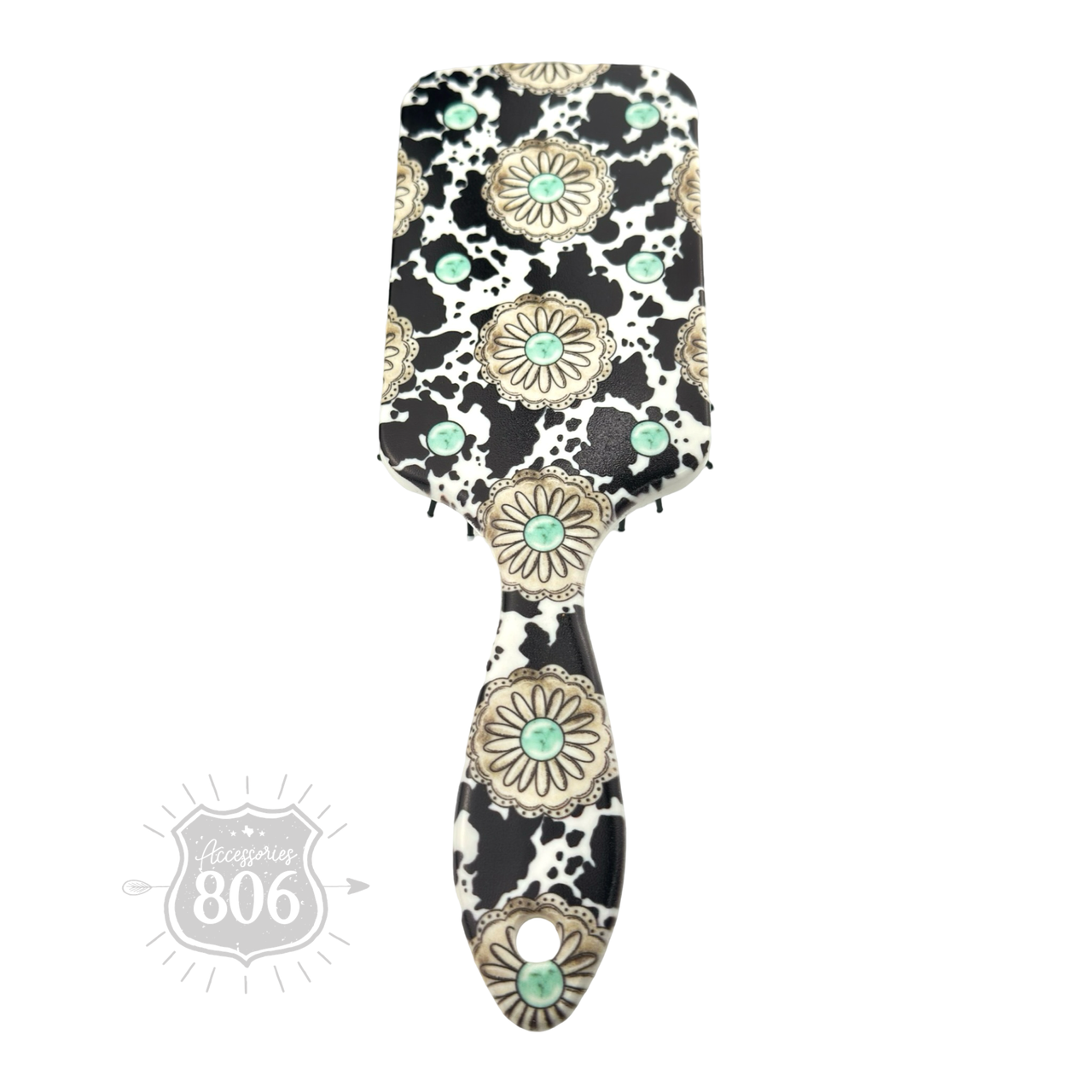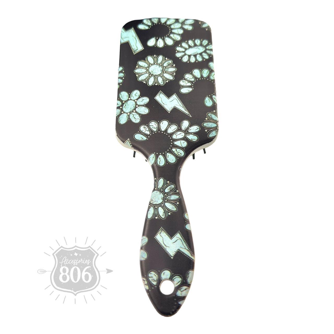 This western print hairbrush has a variety of designs for everyone! It is a paddle brush with rubber tip nylon bristles and a hole at the end of the handle for easy hanging or hooking on your bag.