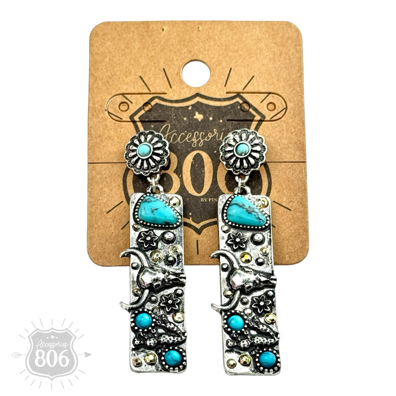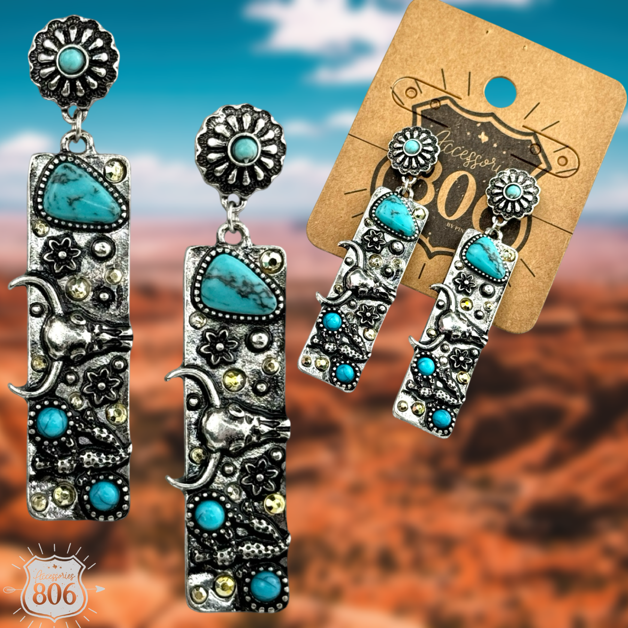 Let these stunning earrings, featuring a silver tone concho post and a turquoise color stone center, transport you to the wild west. The rectangular drop exudes western charm, showcasing a cow skull, cactus, and more turquoise color stones.