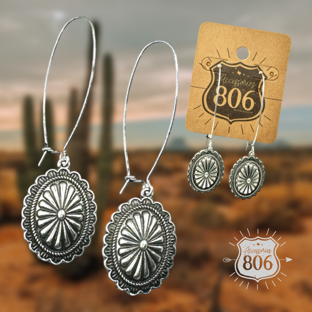 These earrings have a stamped look burnished silver tone oval concho charm on a kidney wire.