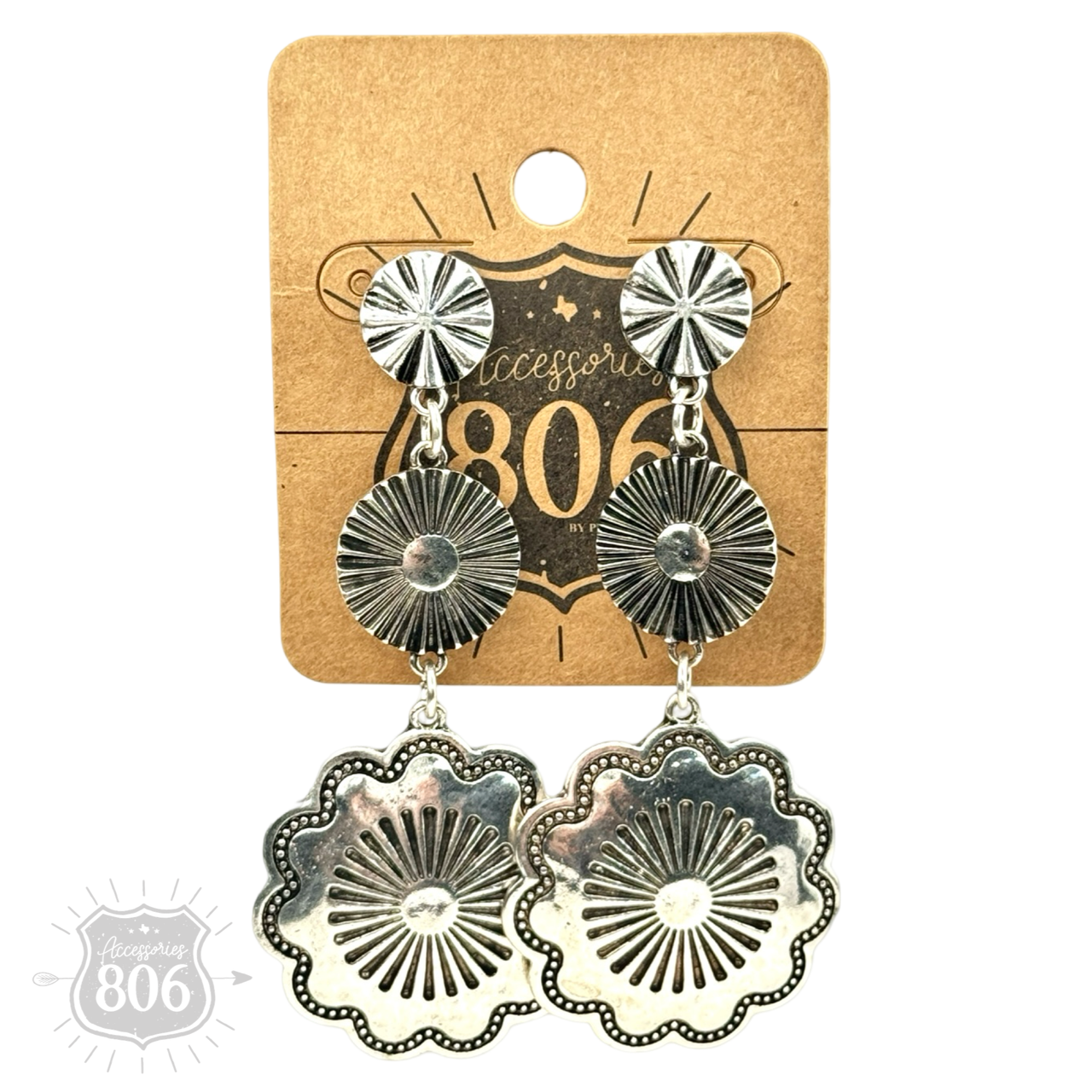 Western style earring has three silver tone stamped look conchos in different styles and sizes. Earring is on a post setting.