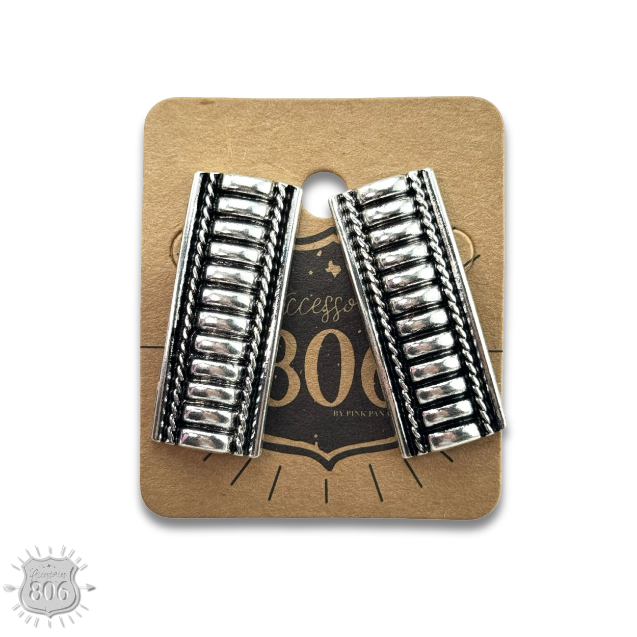 This western style post earring is in a rectangle shape with raised bars giving it an antique or aged look.