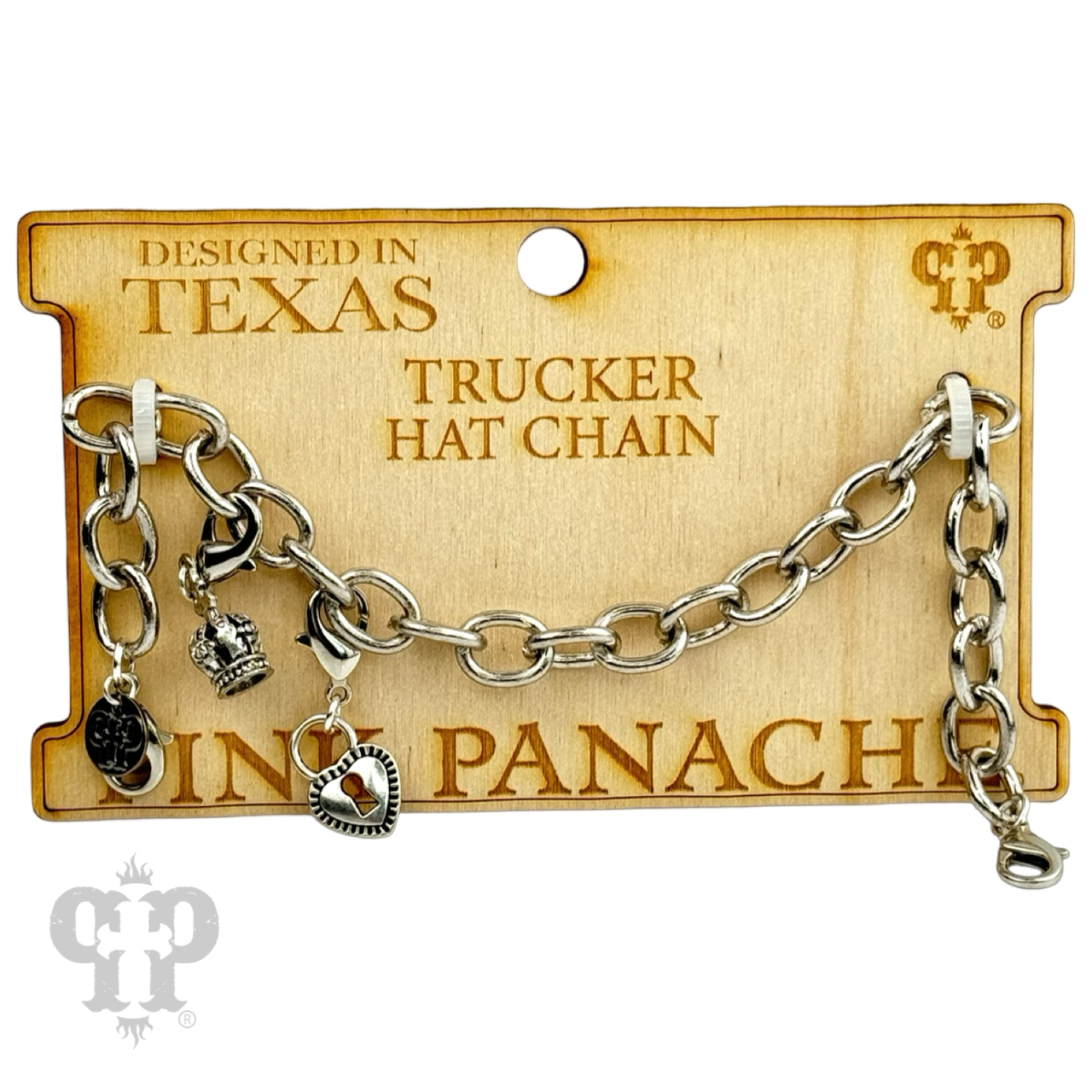Silver tone cable trucker hat chain with removeable silver tone charms. The lobster clasp on either end make it easy to change them out with other chains. Approximately 9.5 inches in length and should fit most trucker hats and caps.