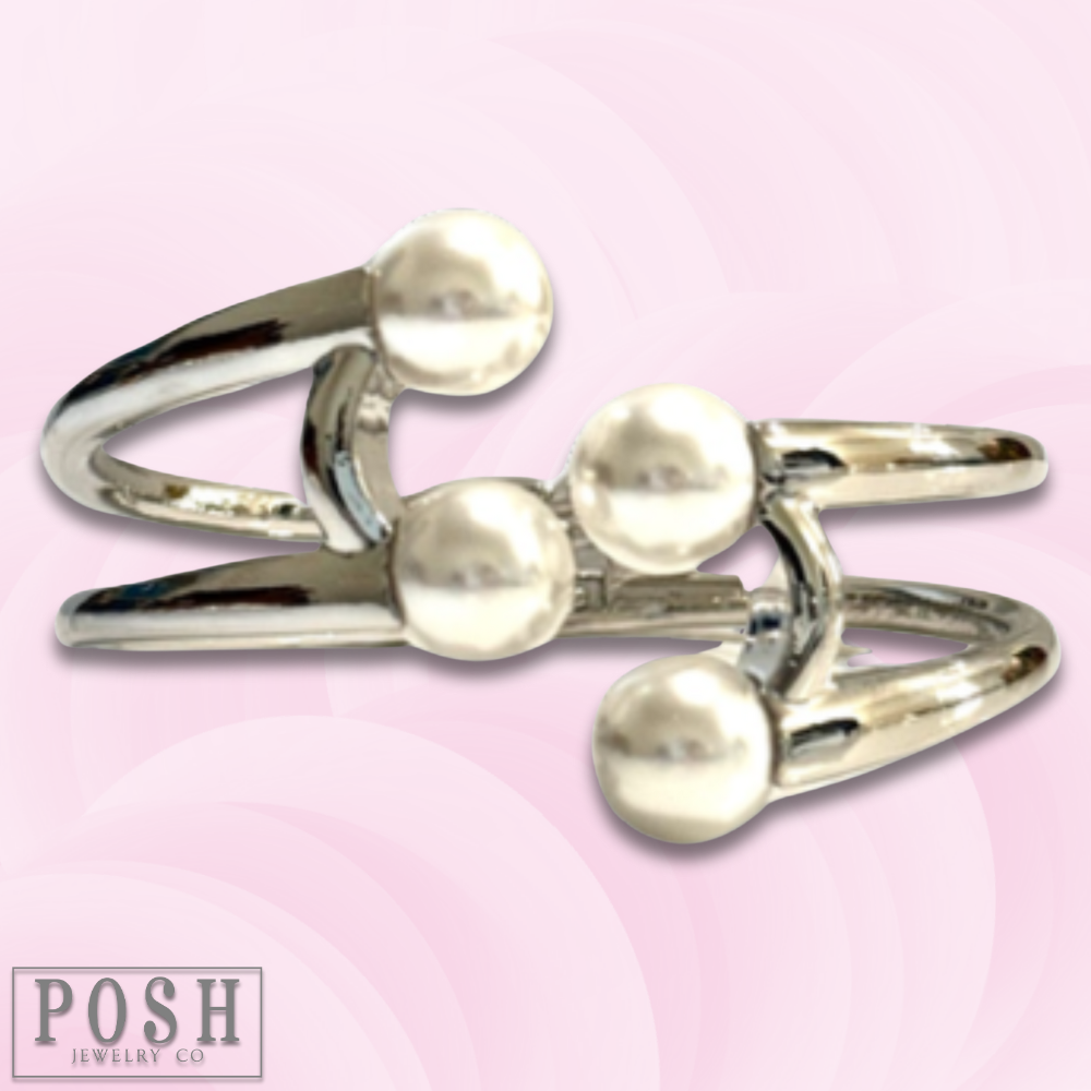This bracelet has pearl beads at the center of the cuff. It is is hinged for easy on and off.