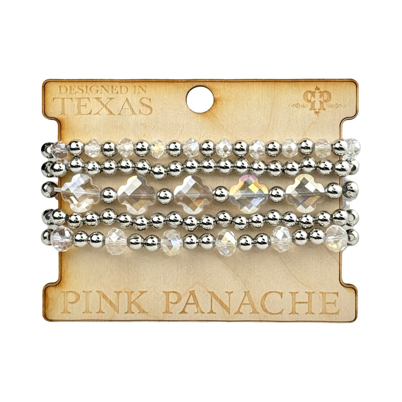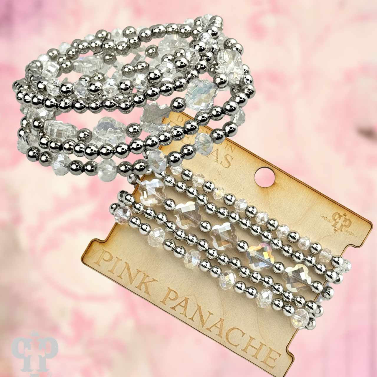 Experience the ultimate sparkle with this five strand bead bracelet set, featuring a mix of metal tone and faceted crystal beads and a touch of shimmering flower crystals. Stretchable for effortless on and off, it's the perfect accessory for most sizes.