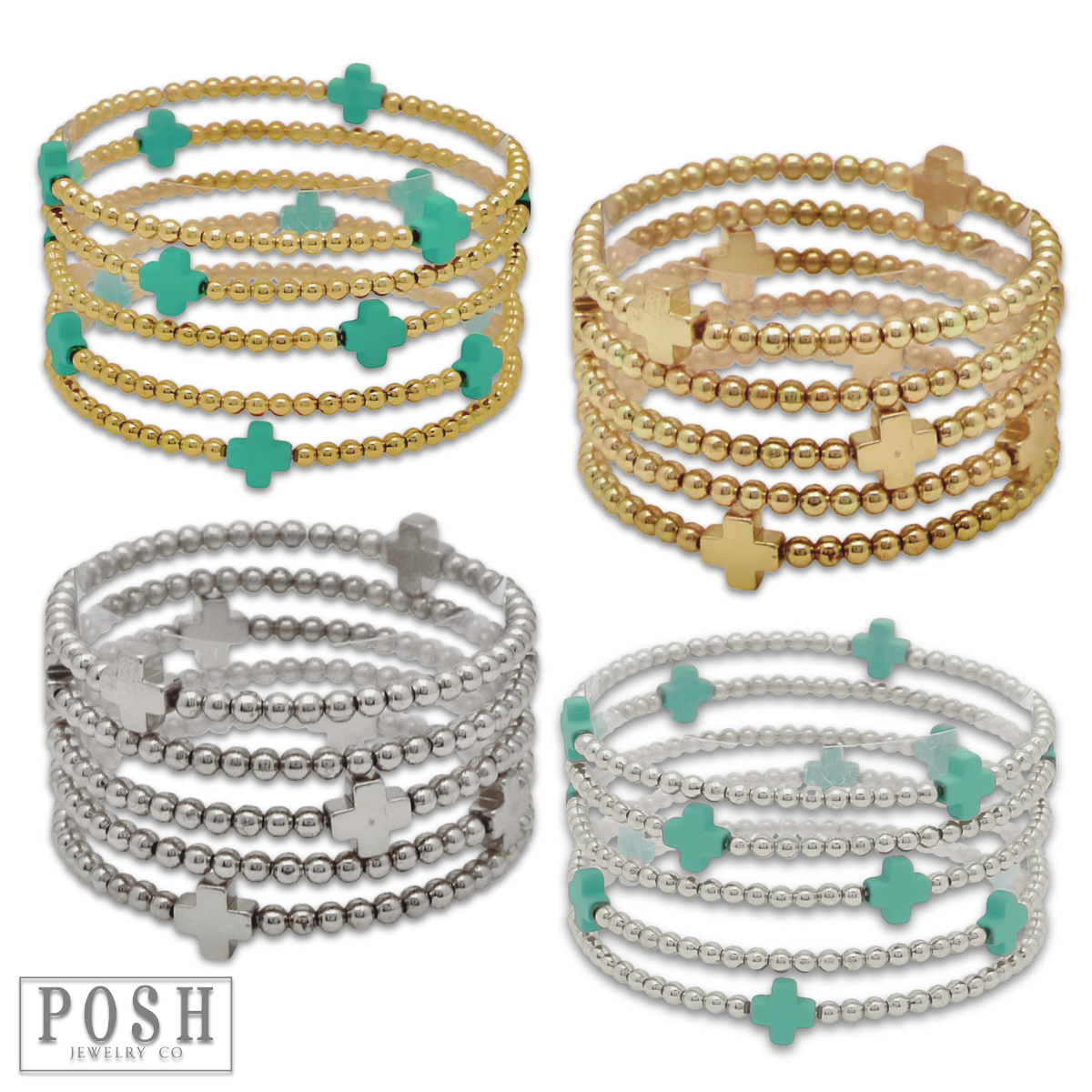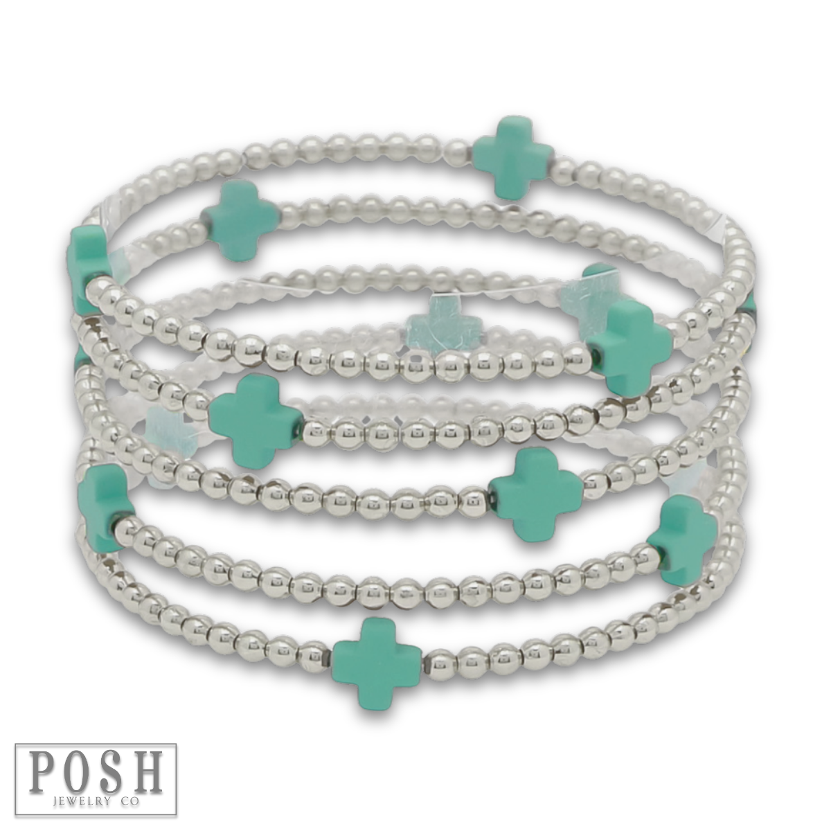 This stacked bracelet set has five strands of small metal tone round beads with two square cross charms per strand. The set is great for layering with other pieces and stretches for easy on and off.