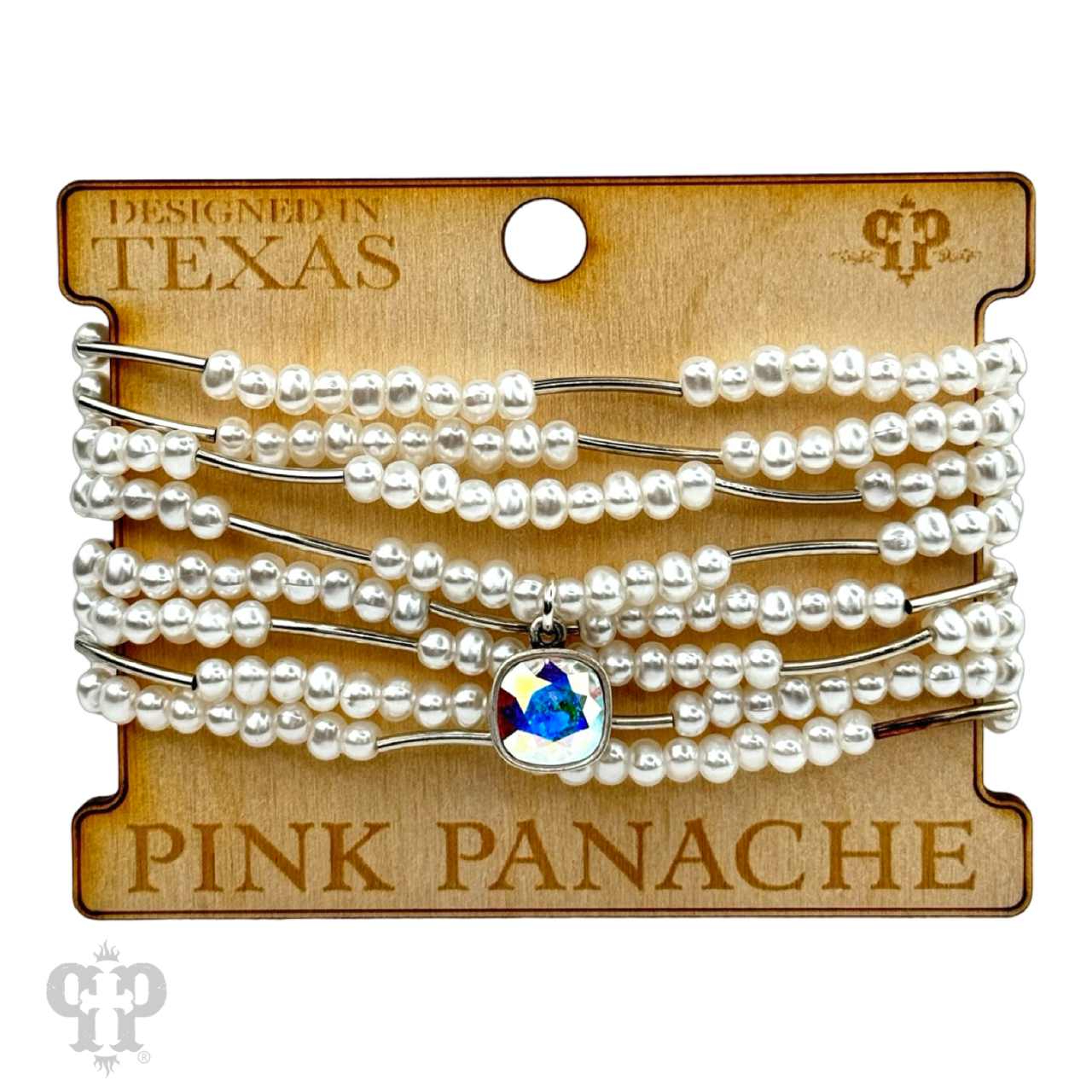This bracelet set includes eight strands of crystal and gold tube beads.  The charm is a 10mm Austrian crystal in a setting custom made for Pink Panache in the USA.  Stretches for easy on and off.