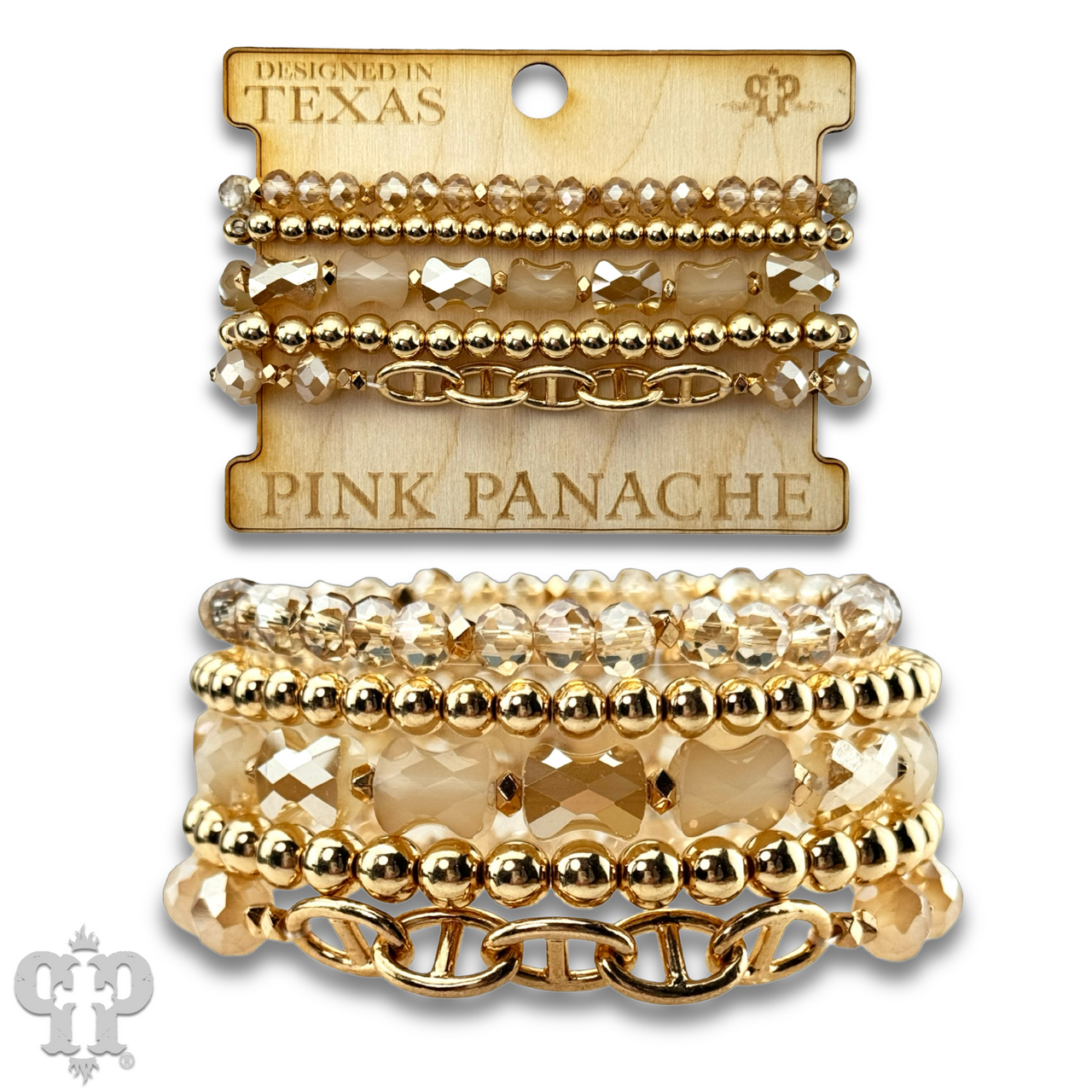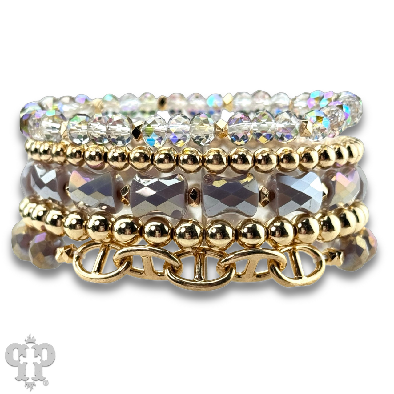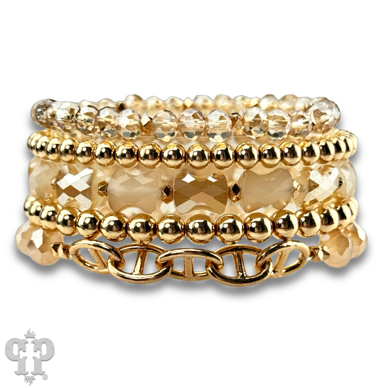 This bracelet has 5 strands of gold tone and faceted, mixed size, beads.  There is a chain feature on one of the strands.