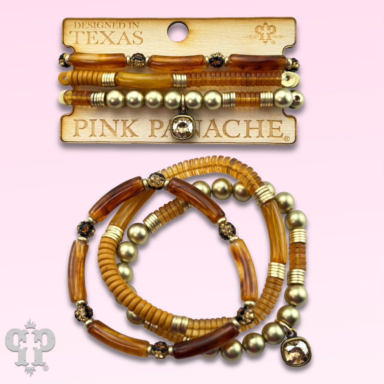 Rock this bracelet like a boss with its triple strands of dazzling golden, tortoise shell, and caramel-colored bamboo beads. And let's not forget about the shiny Austrian crystal and stretch and for ultimate comfort.