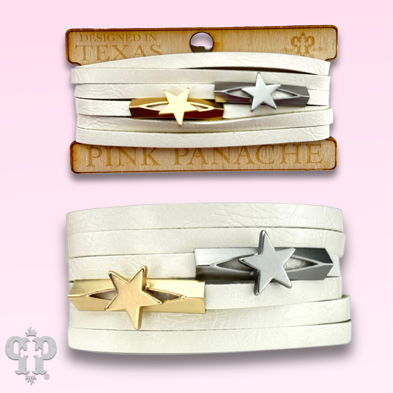 This bracelet has six strands of white with gold and silver star charms.  It has a magnetic clasp.