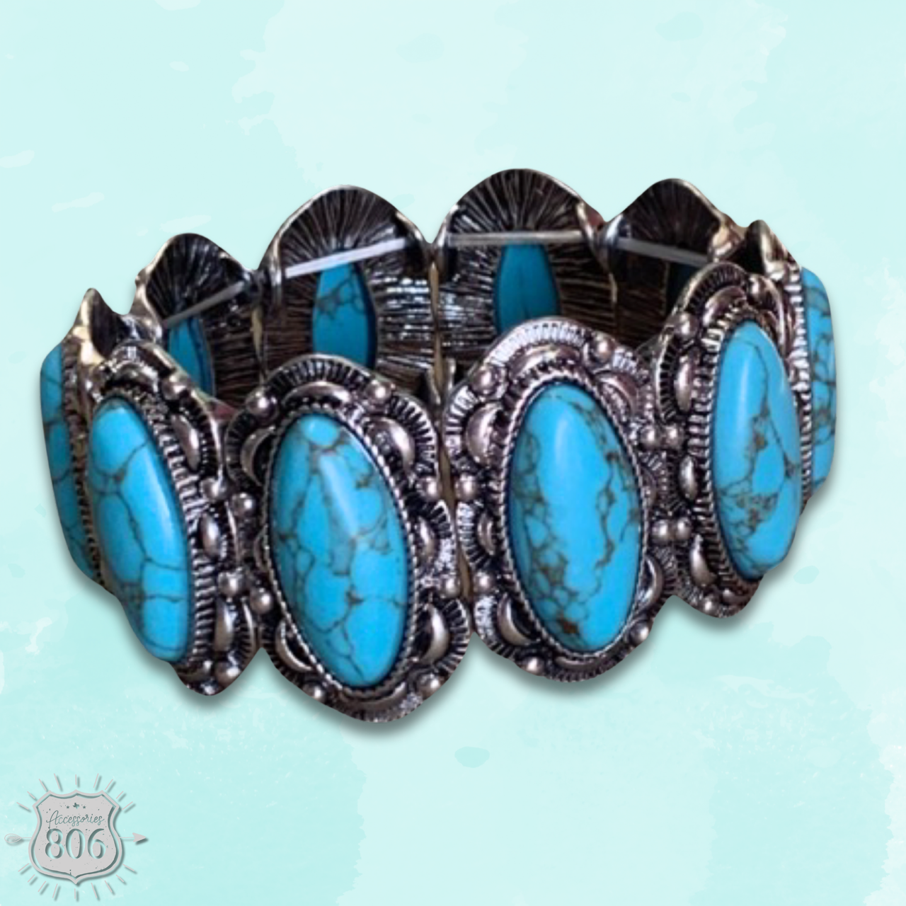 This stretch bracelet features oval shaped stones in western look silver color setting.