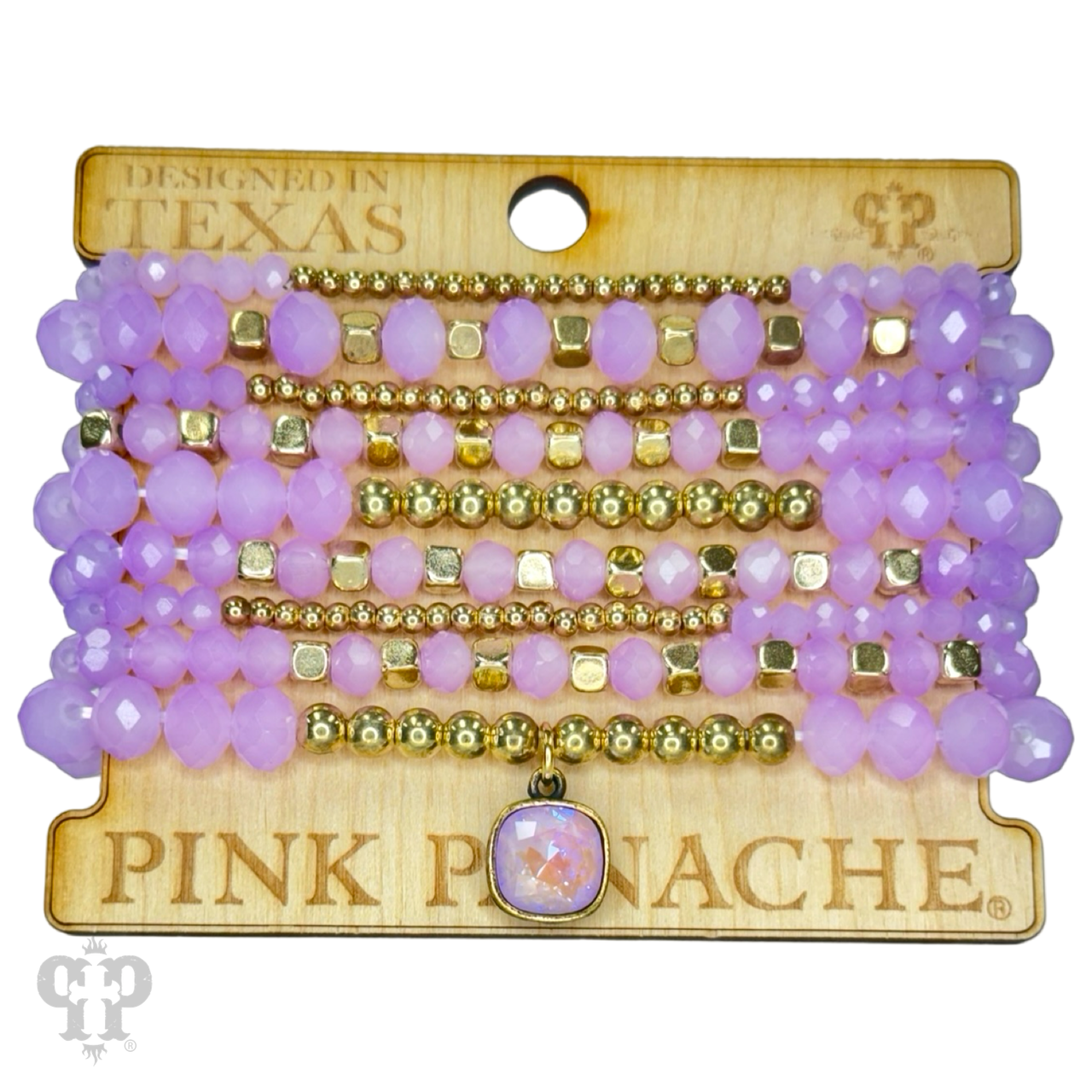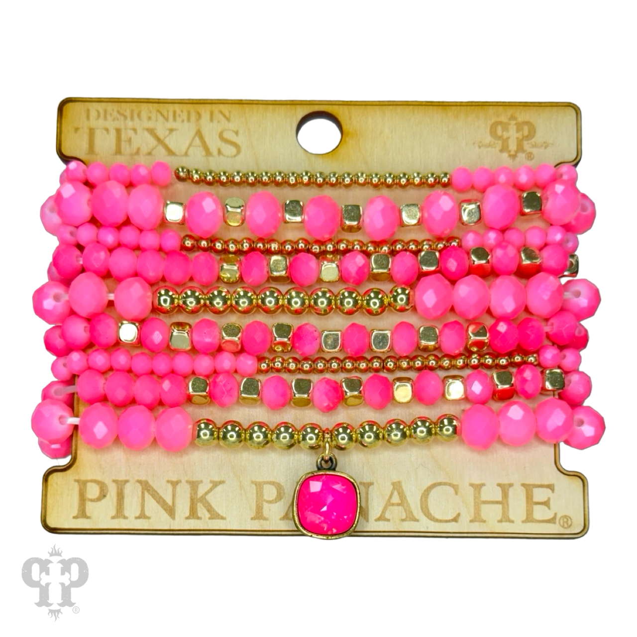 This bracelet has nine strands of faceted crystal beads in several sizes and features a 10mm Austrian crystal drop in a setting custom made for Pink Panache in the USA. Bracelet stretches for easy on and off. One size fits most.