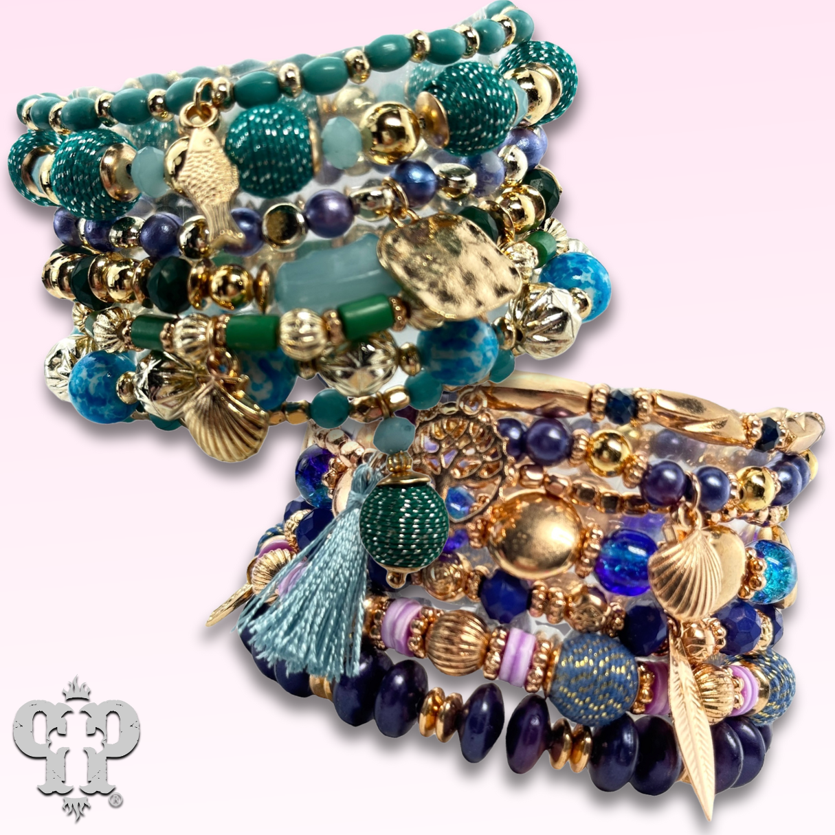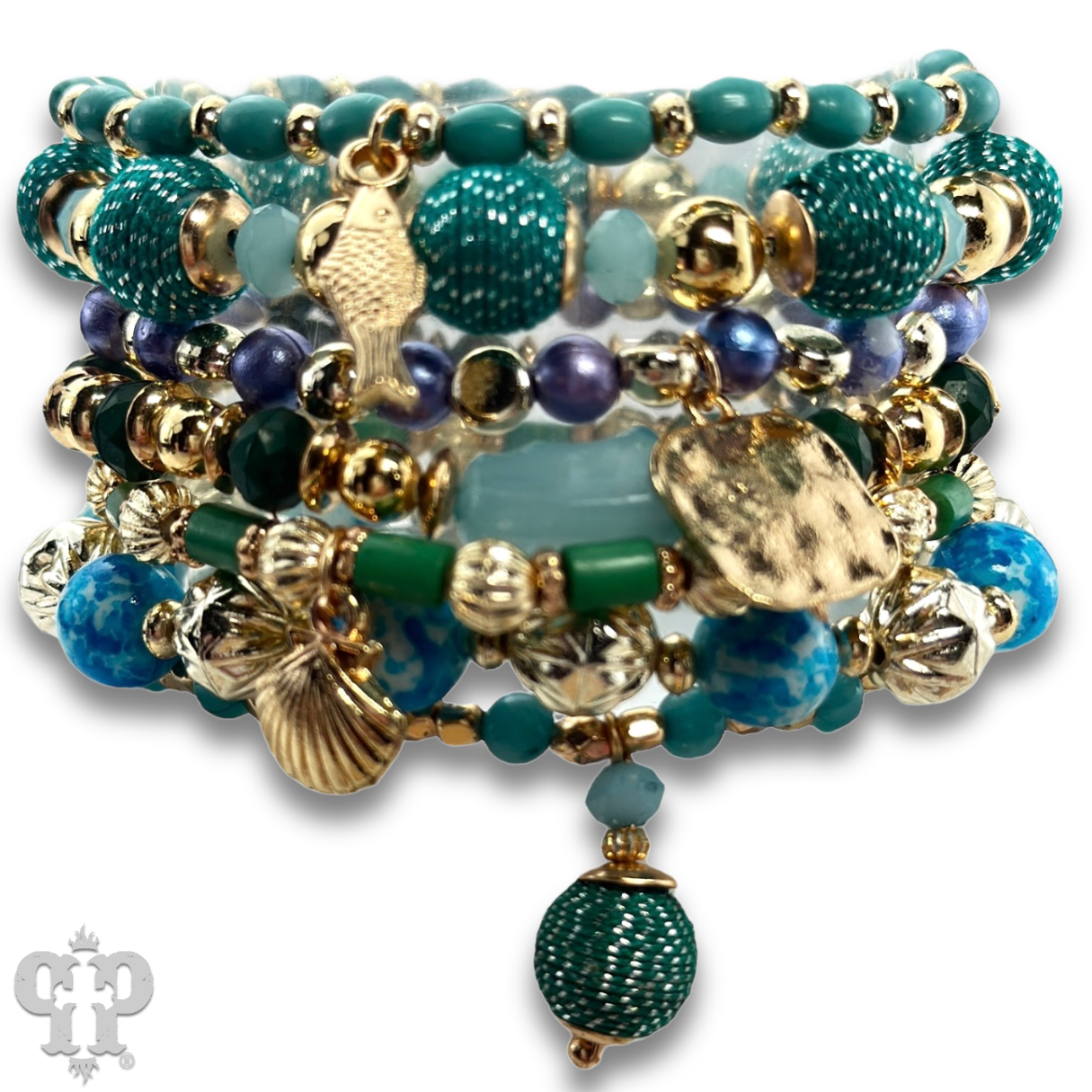 This bracelet has various sized color beads and gold tone beads mixed into seven strands. It features charms dangling from some strands and stretches on and off for ease of wear.