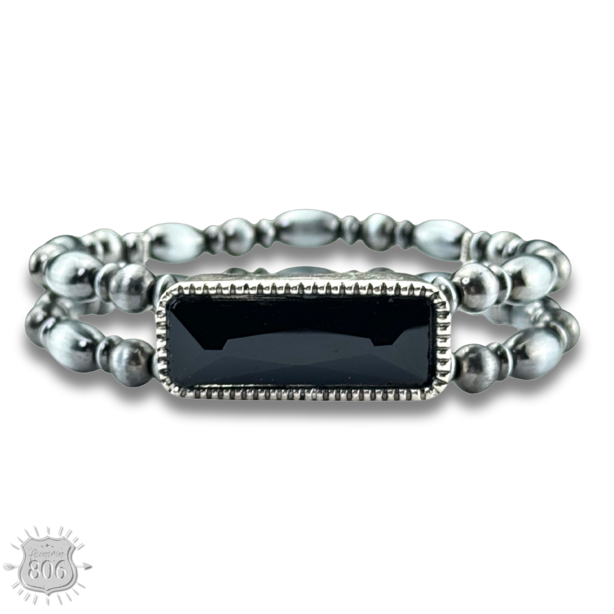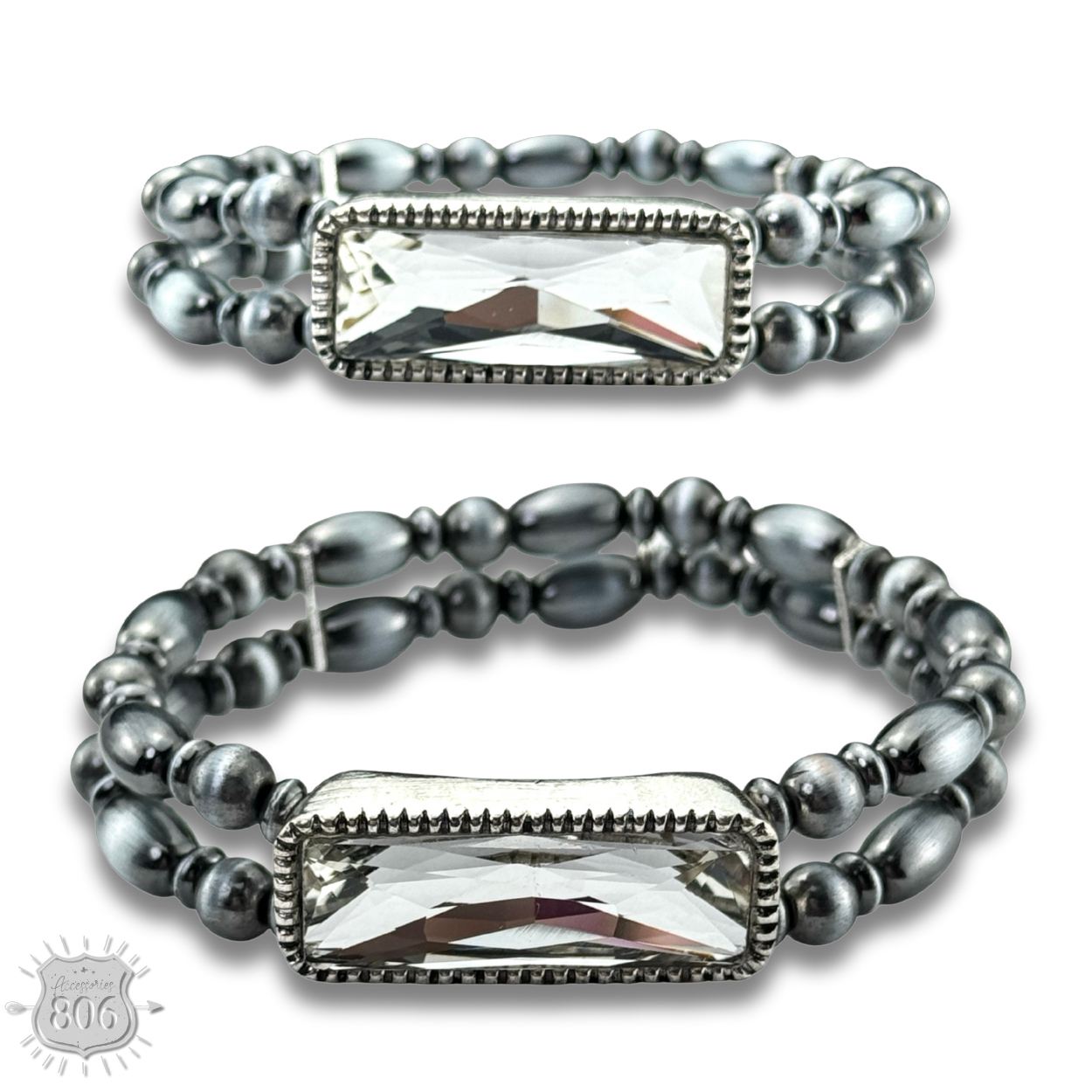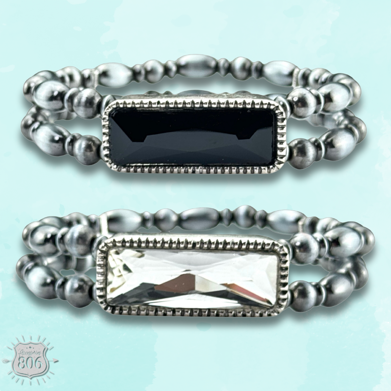 This bracelet has a faceted rectangle rhinestone in a silver tone setting with two strands of burnished silver beads. It stretches for easy on and off.