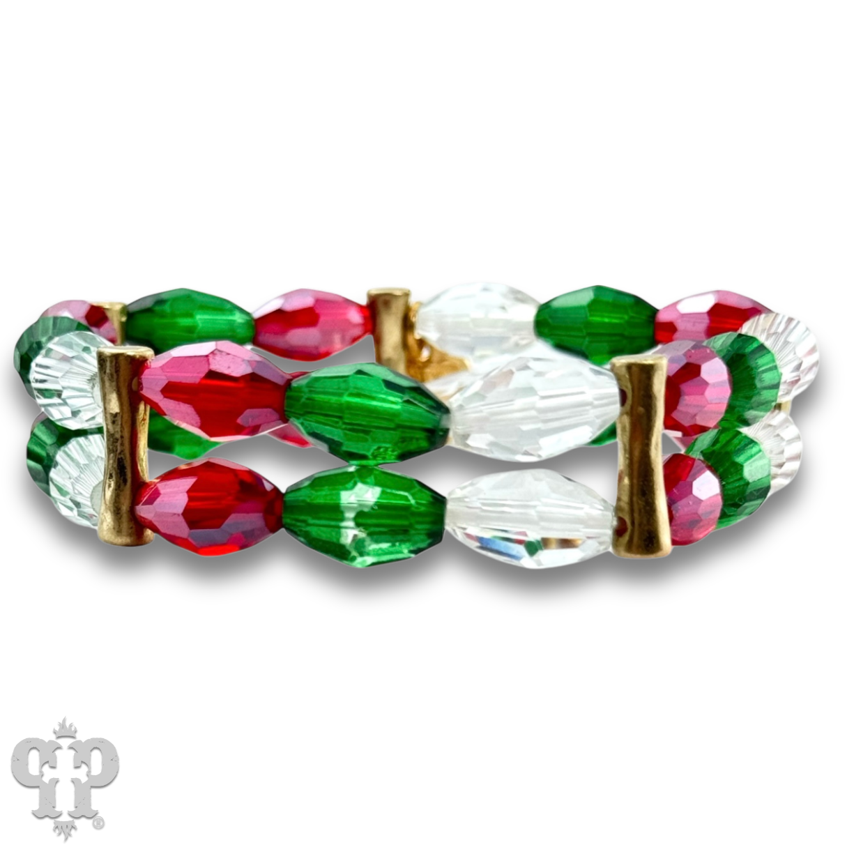 This double strand bracelet includes glass beads and gold tone spacer bars.
