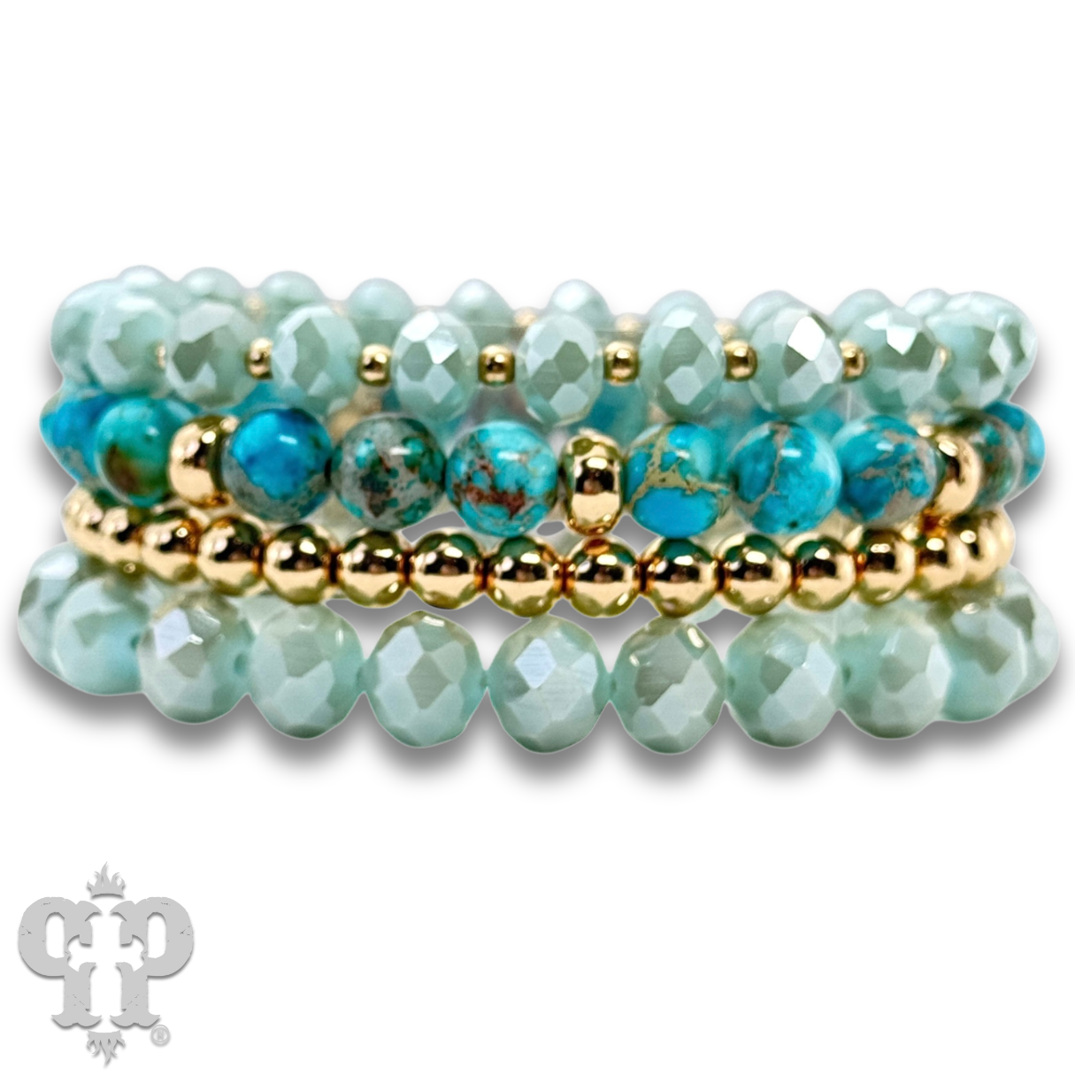 This bracelet has four strands of smooth round and faceted colorful beads along with smooth round gold tone beads.