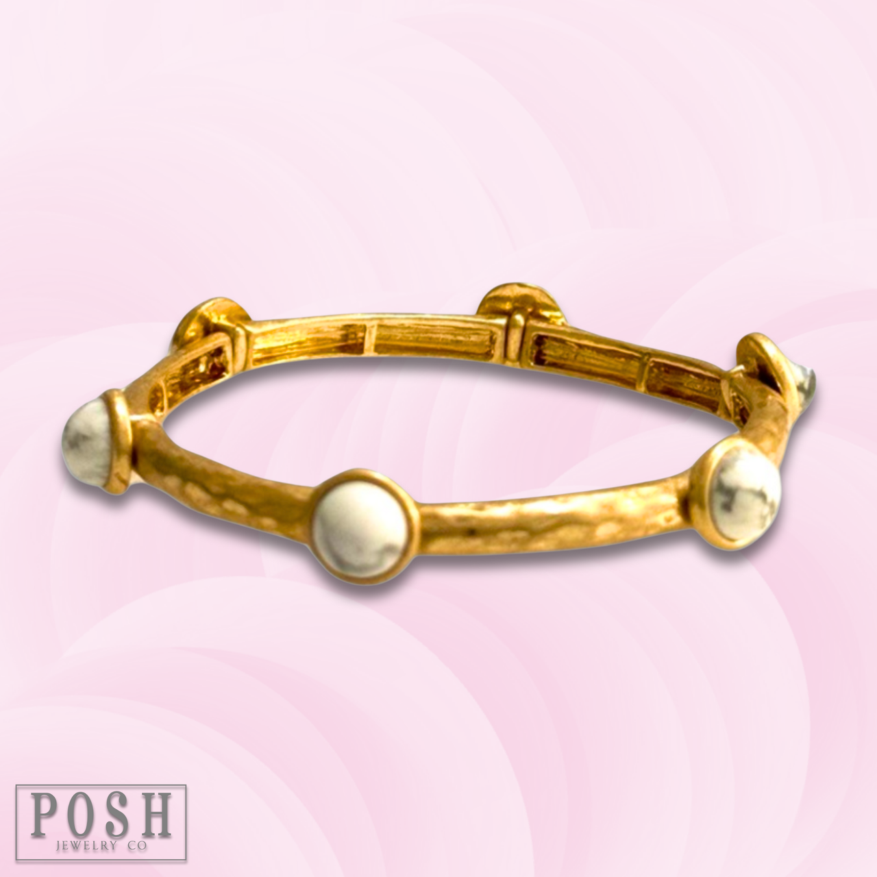 Satin finish gold tone cuff bracelet with a half-round bead features between each section. It stretches for easy on and off.