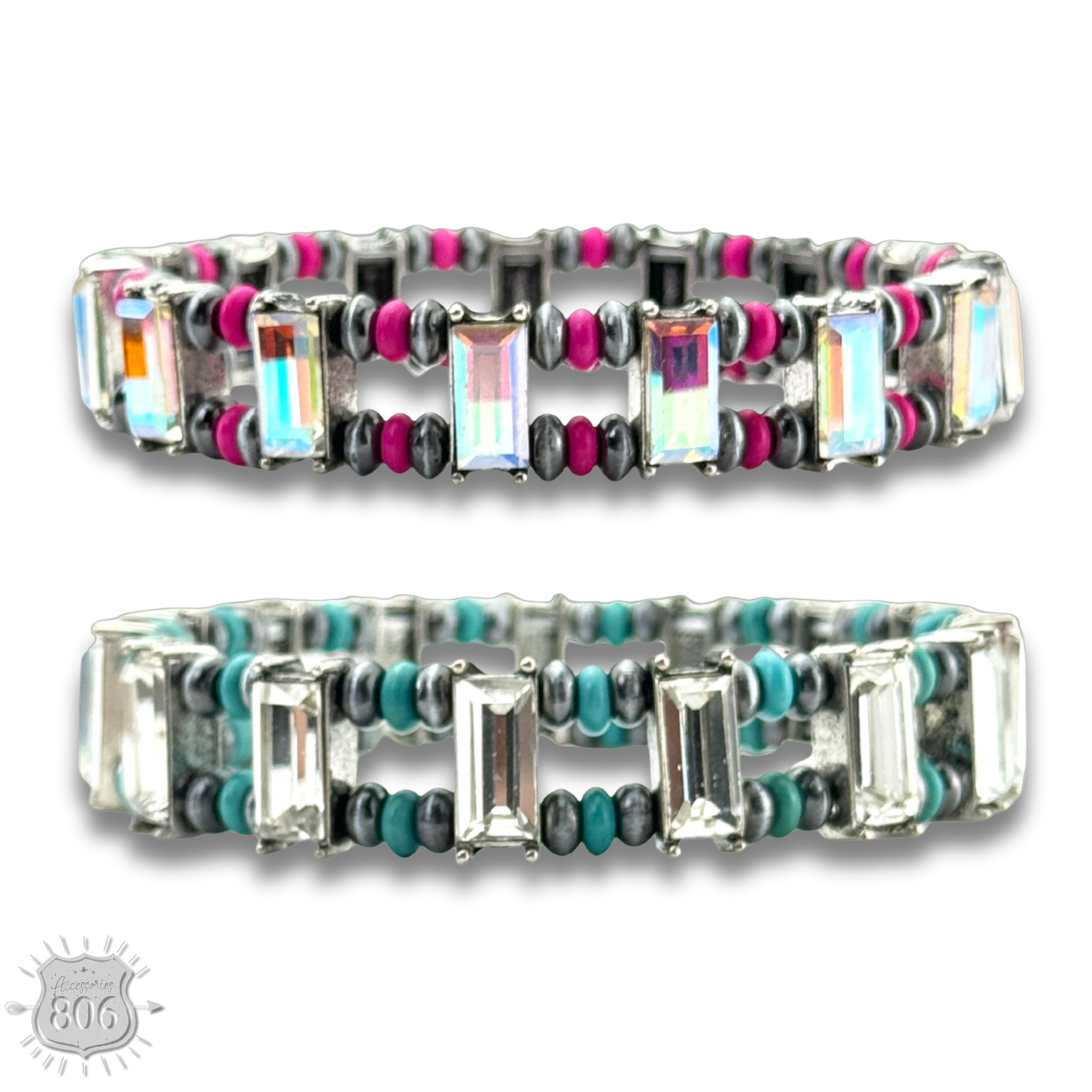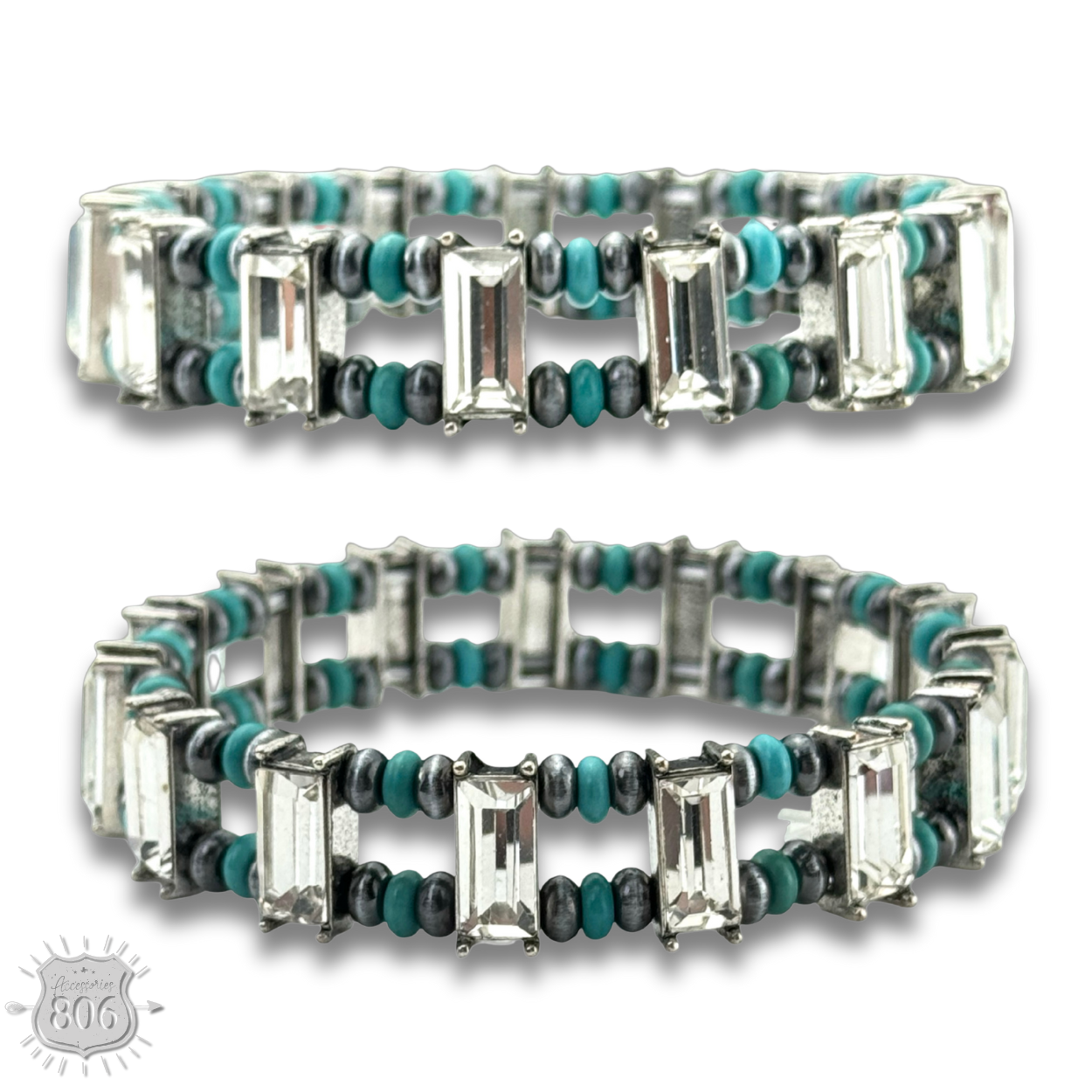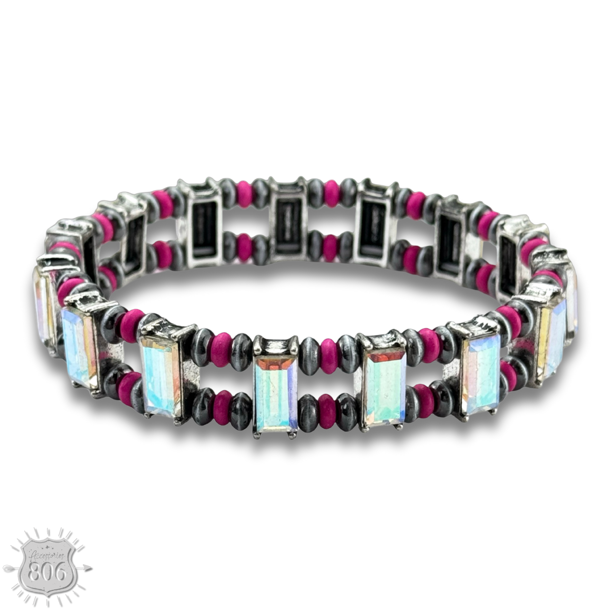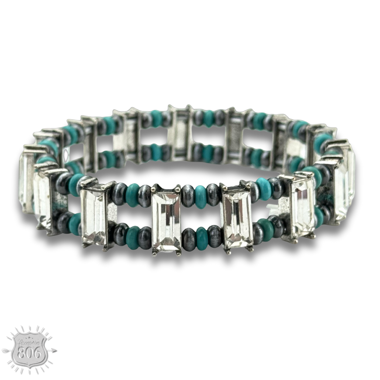 This stretch bracelet features rectangle rhinestones as well as burnished silver tone and stone saucer beads. One size fits most.