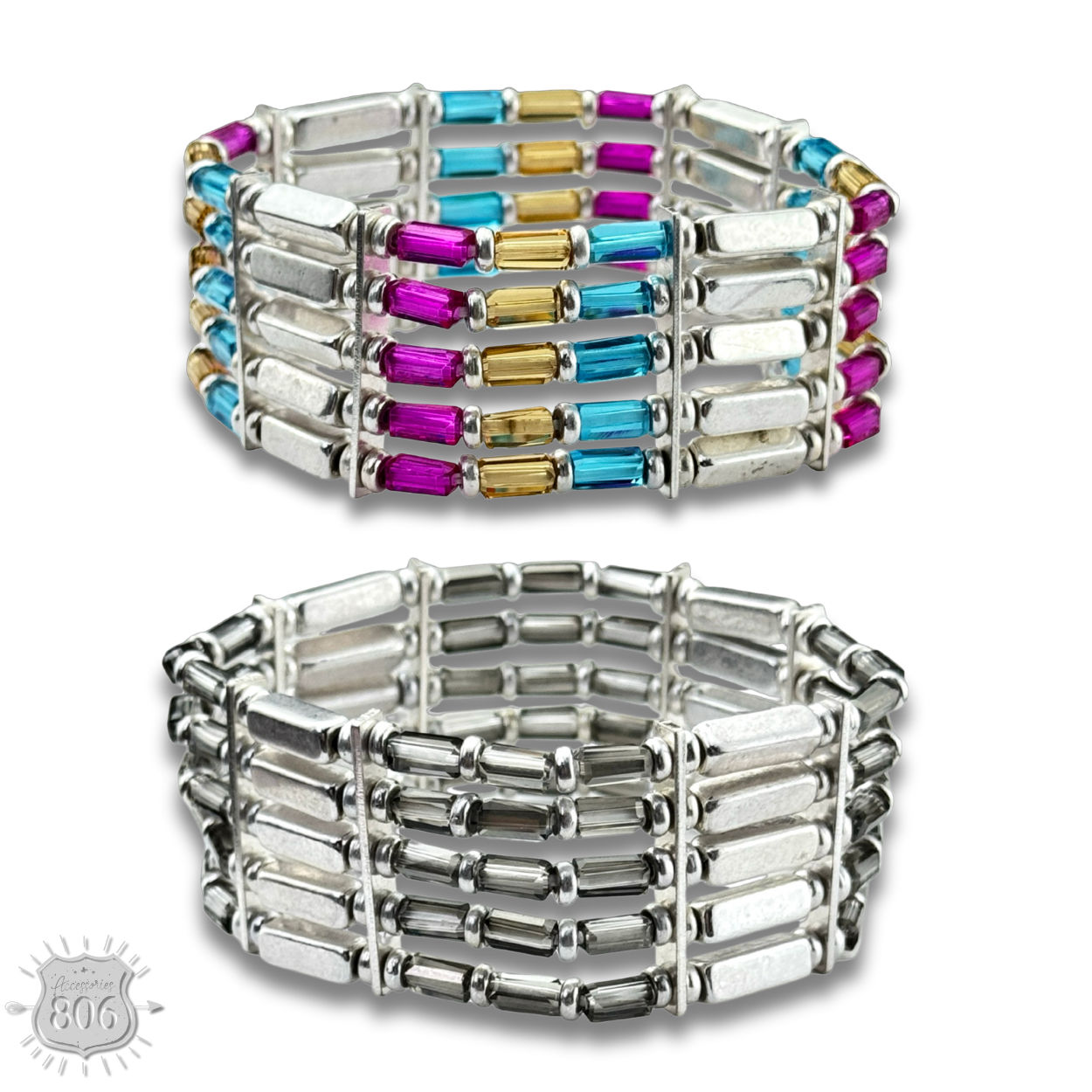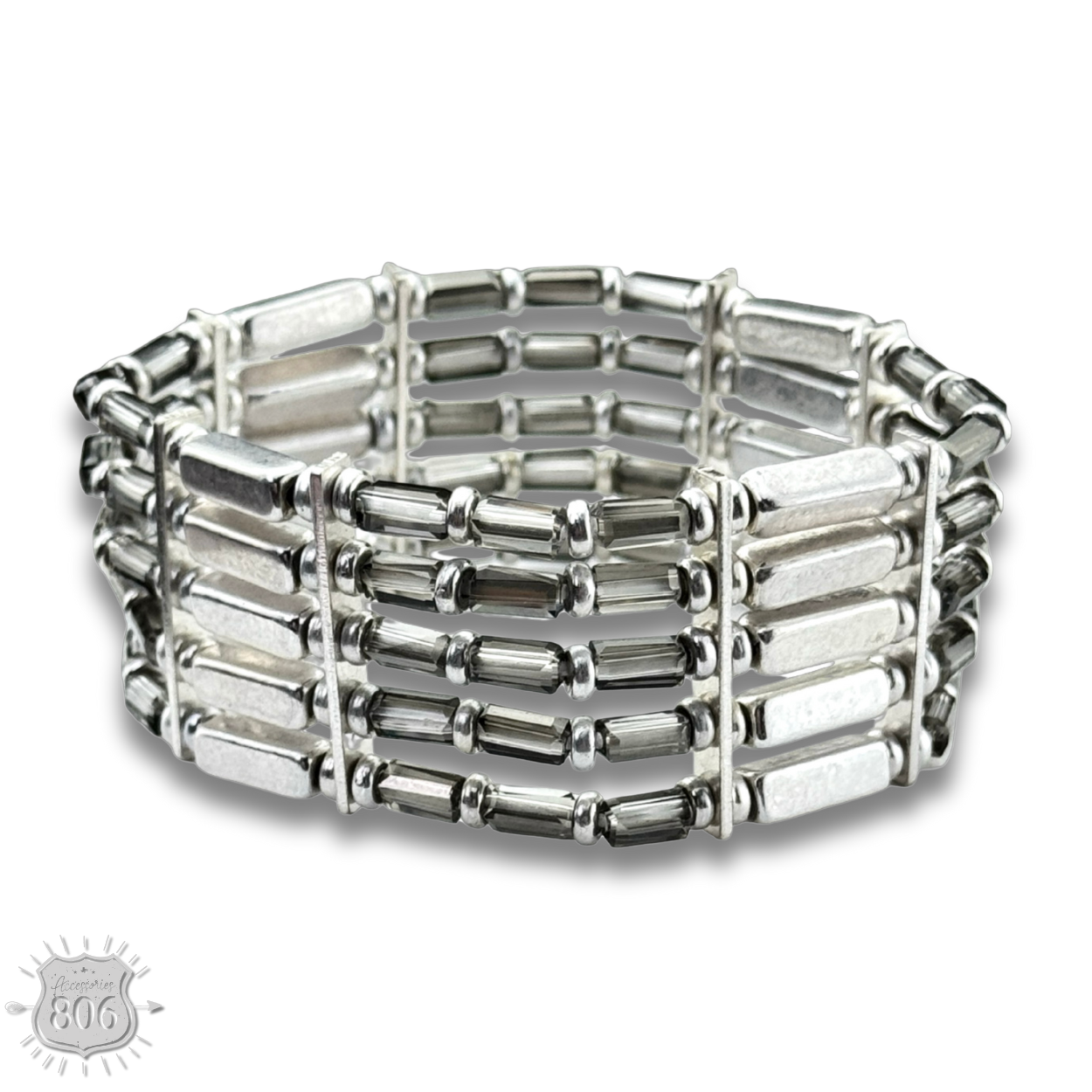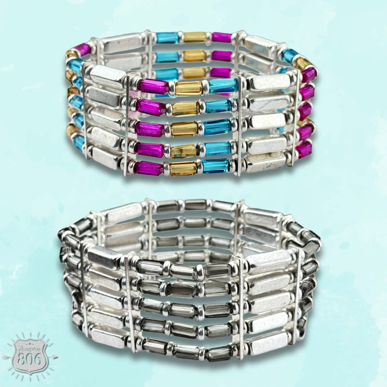 This stretchy bracelet is made of five strands of tubular beads that are linked together with spacer bars. It easily stretches on and off for a comfortable fit.