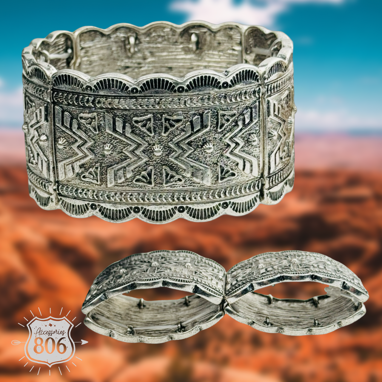 Southwest style bracelet cuff featuring stamped look silver tone scalloped edge.