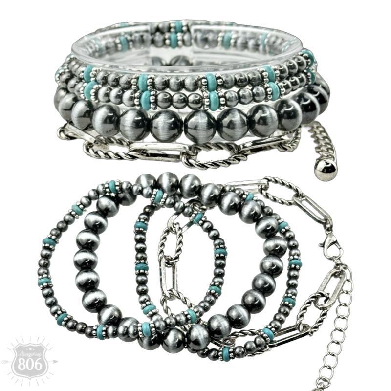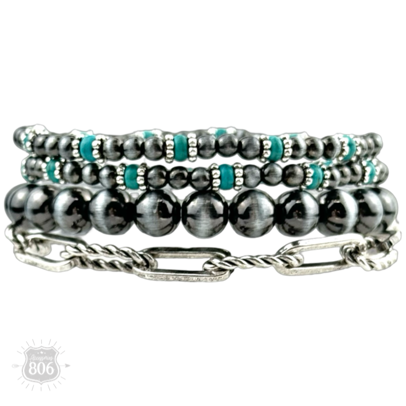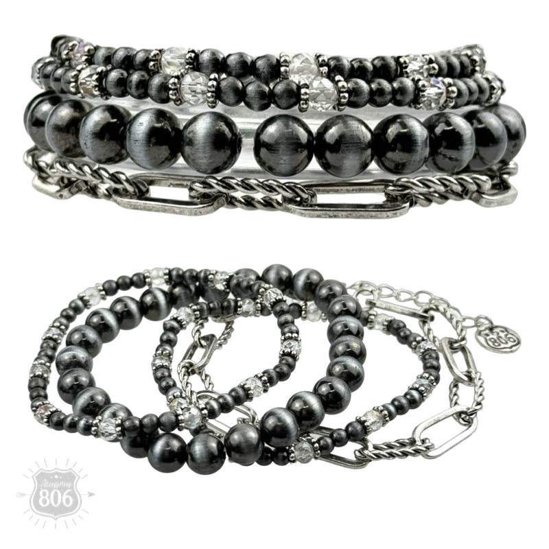 This bracelet set has several strands of silver tone burnished pearl beads and dyed stone beads mixed in.  There is also one strand of paperclip chain with a lobster clasp and extender chain.