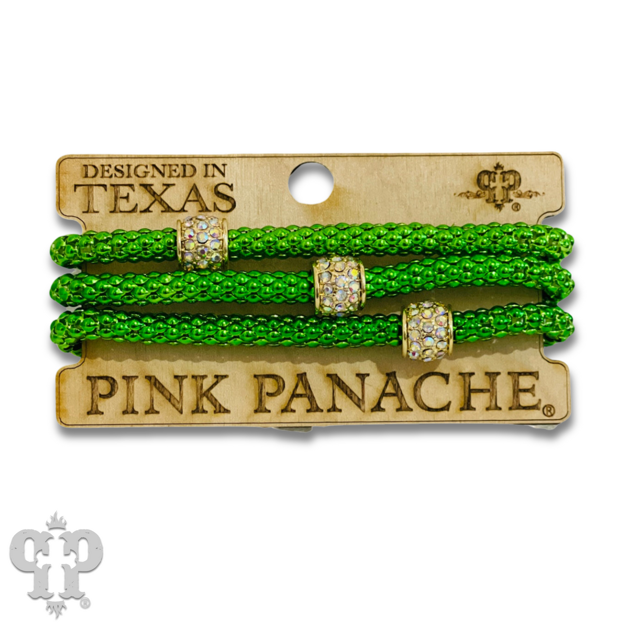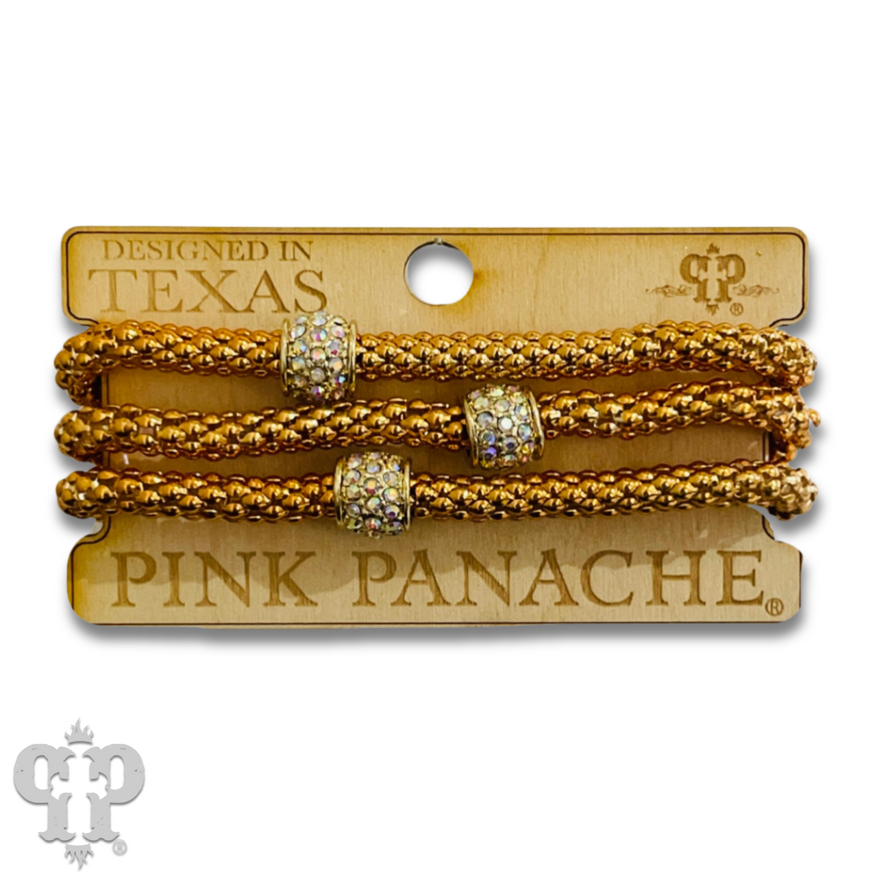 This bracelet set has three strands of woven mesh and features three pave rondelle beads.