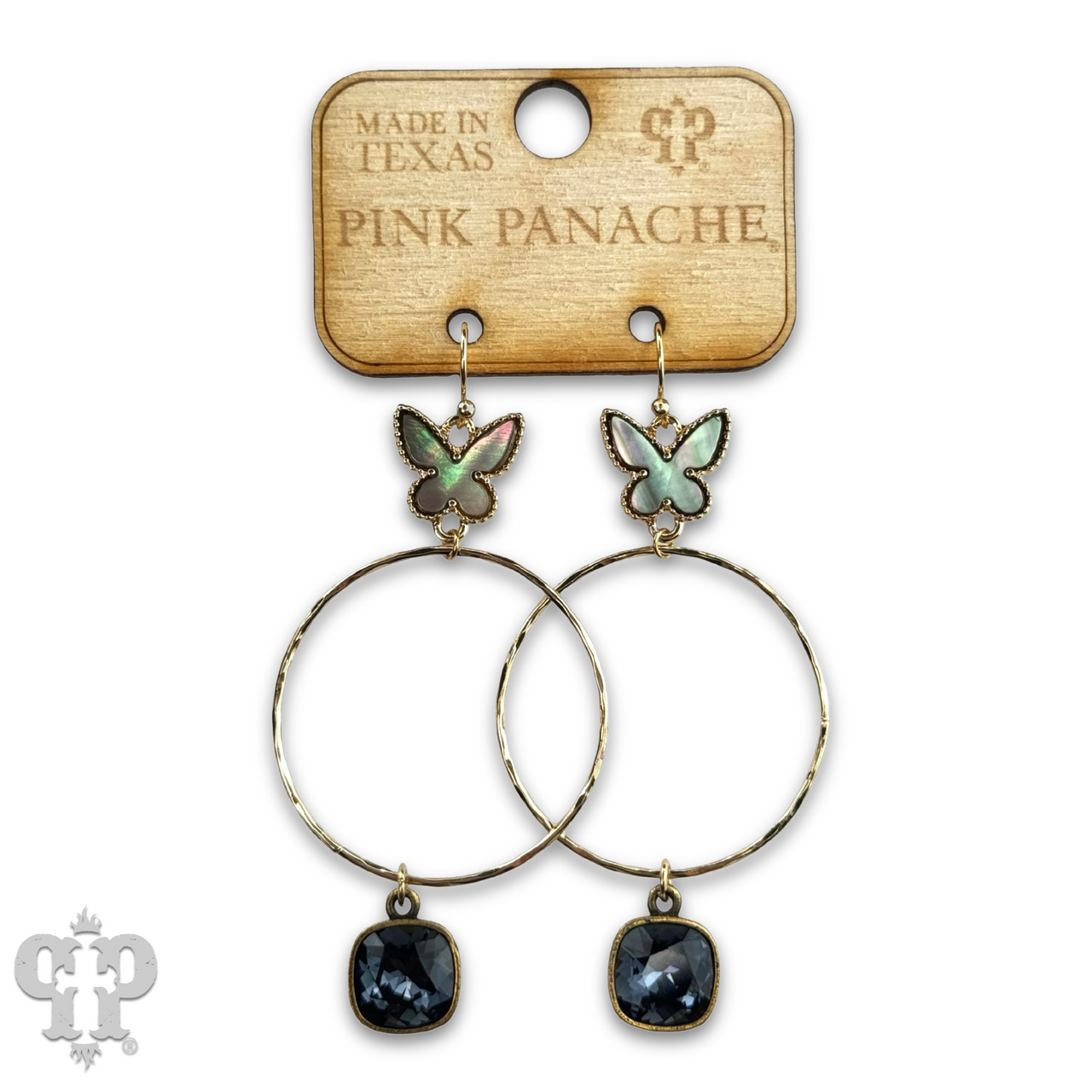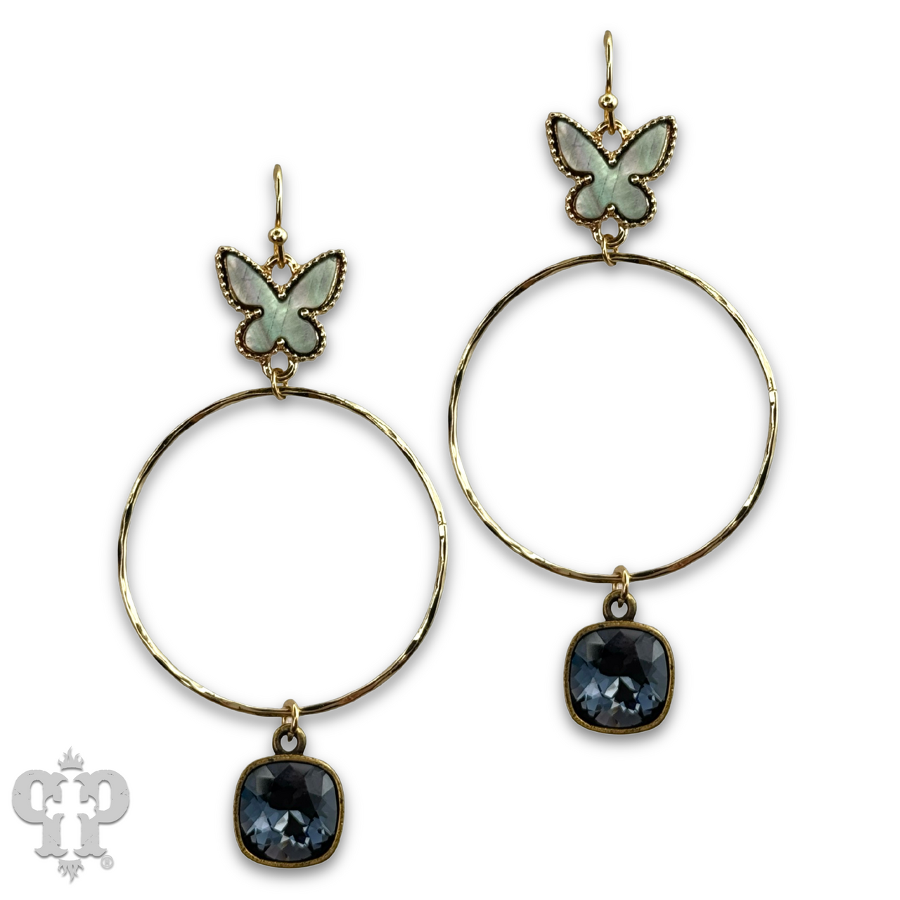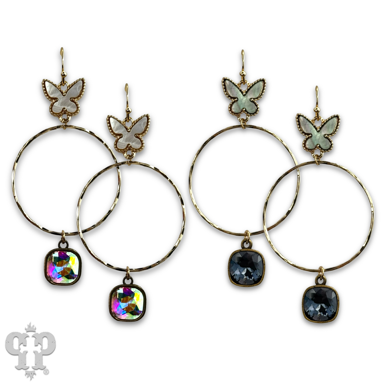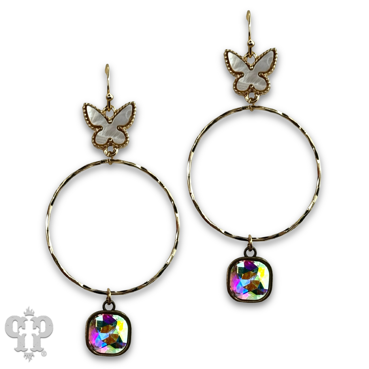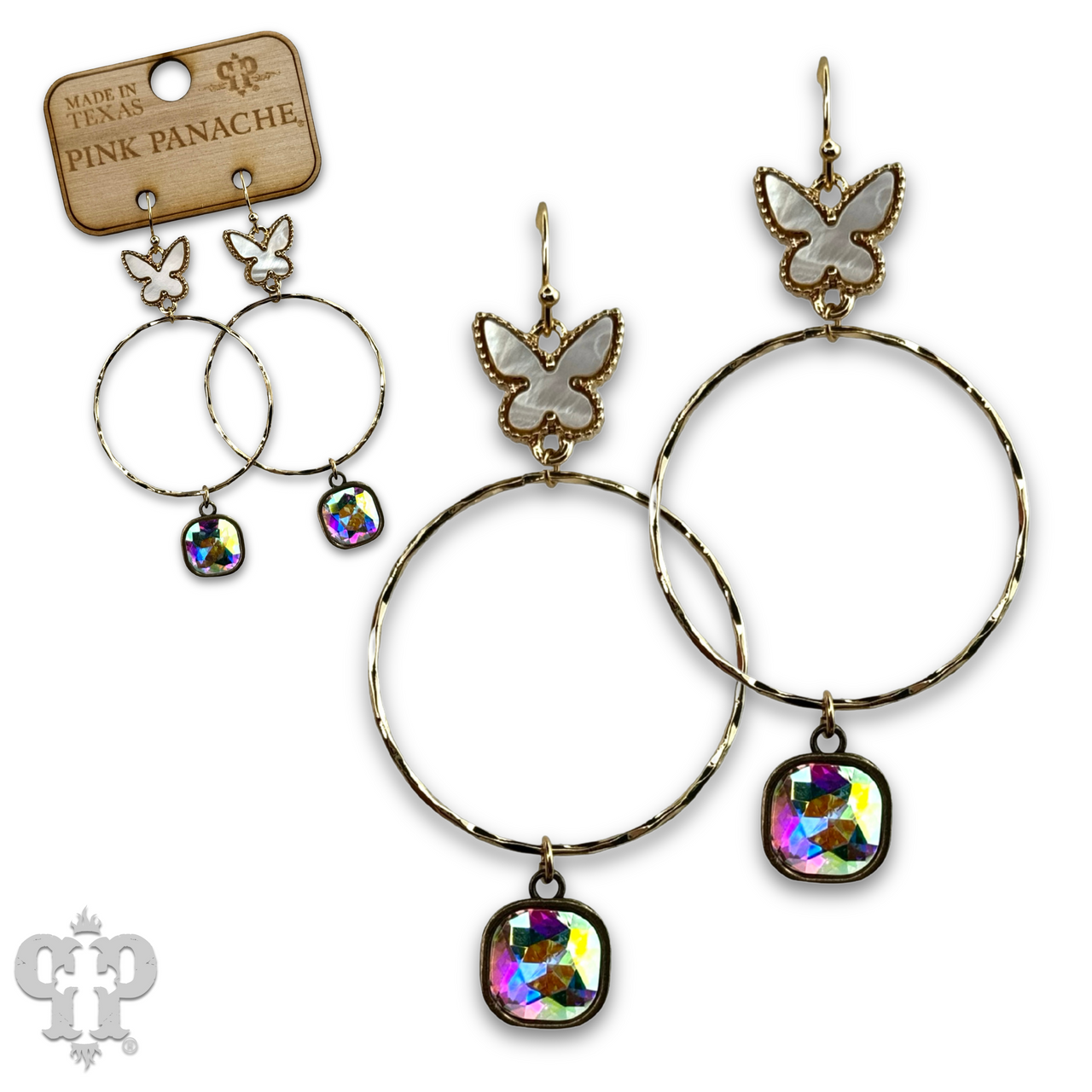 These gold tone circle earrings hang from a pearlized finish butterfly charm. They have an Austrian crystal, in a setting custom made for Pink Panache in the USA, hanging from the bottom.