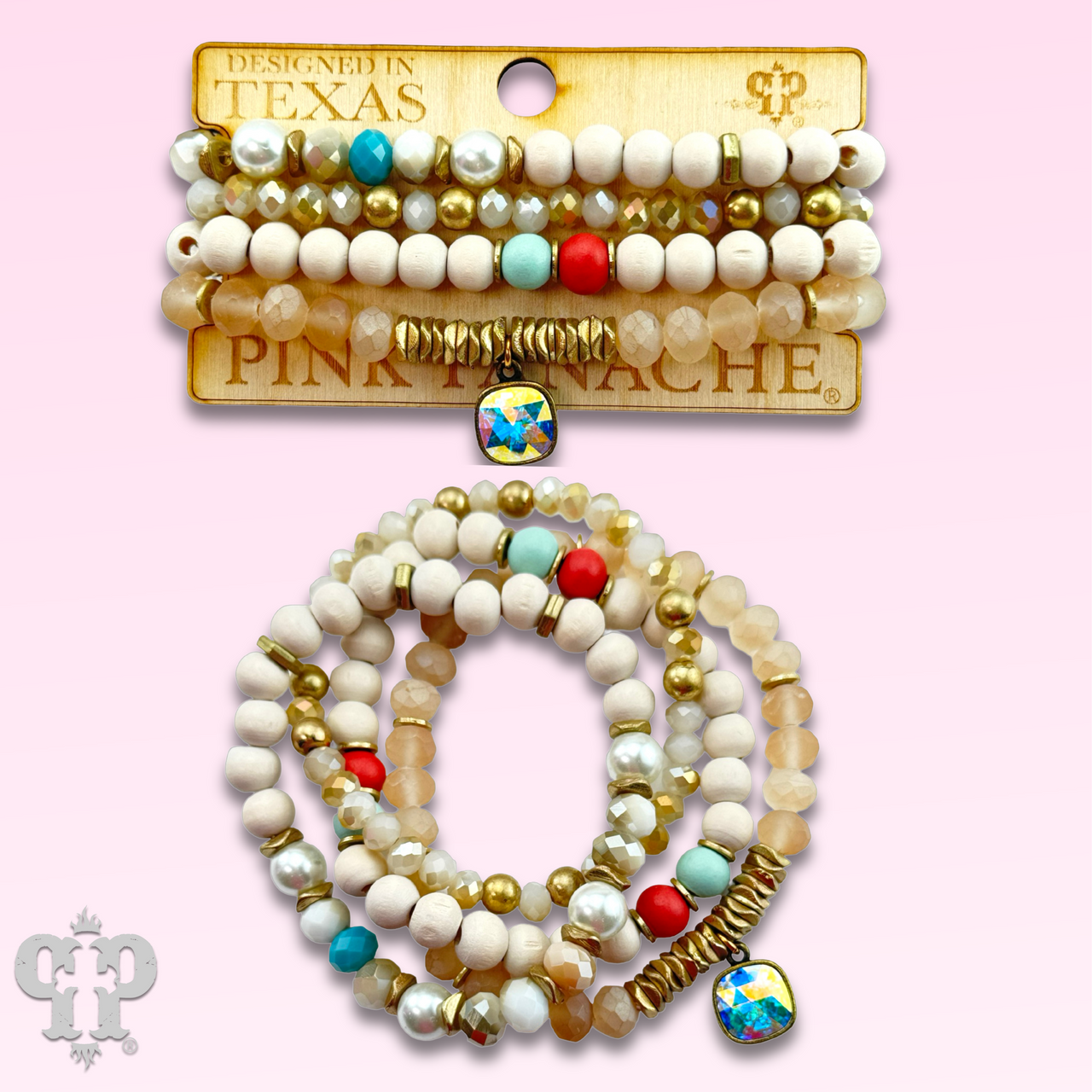 This bracelet features four strands of playful multi-colored, white, and cream beads, along with a dazzling Austrian crystal charm in a setting custom made for Pink Panache in the USA. Plus, it stretches for effortless wear!