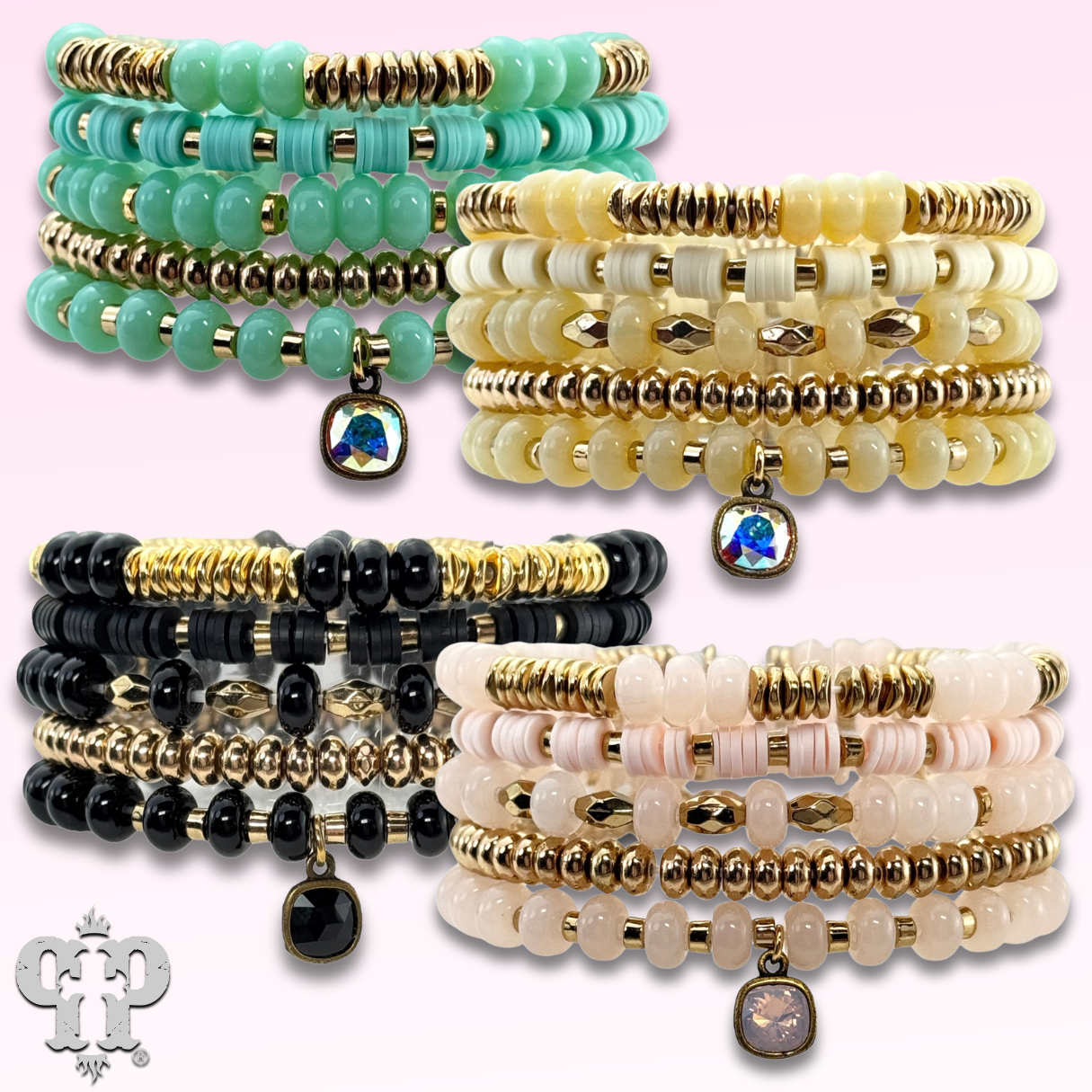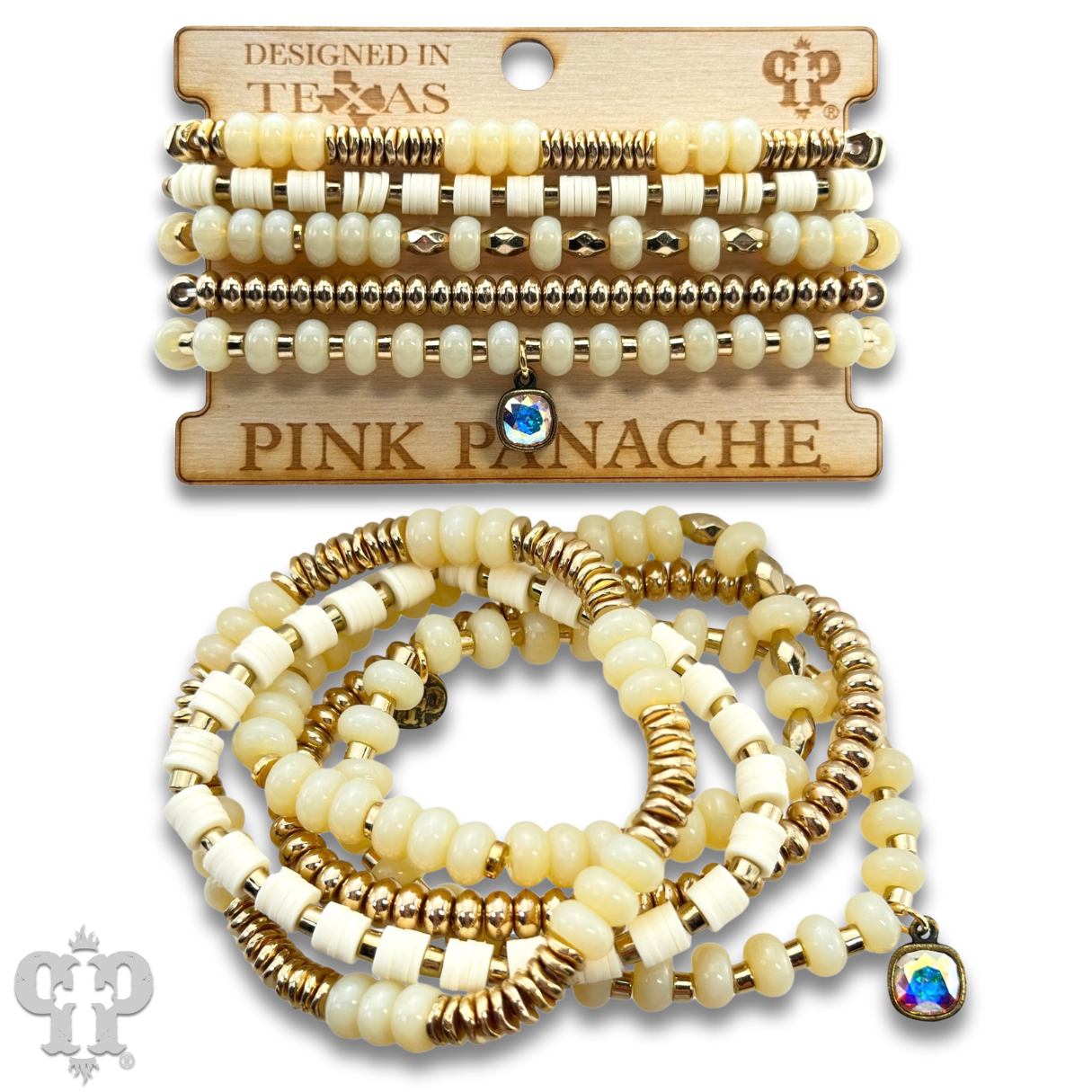 This bracelet set has five strands of mixed color and gold color beads in a variety of shapes and sizes.