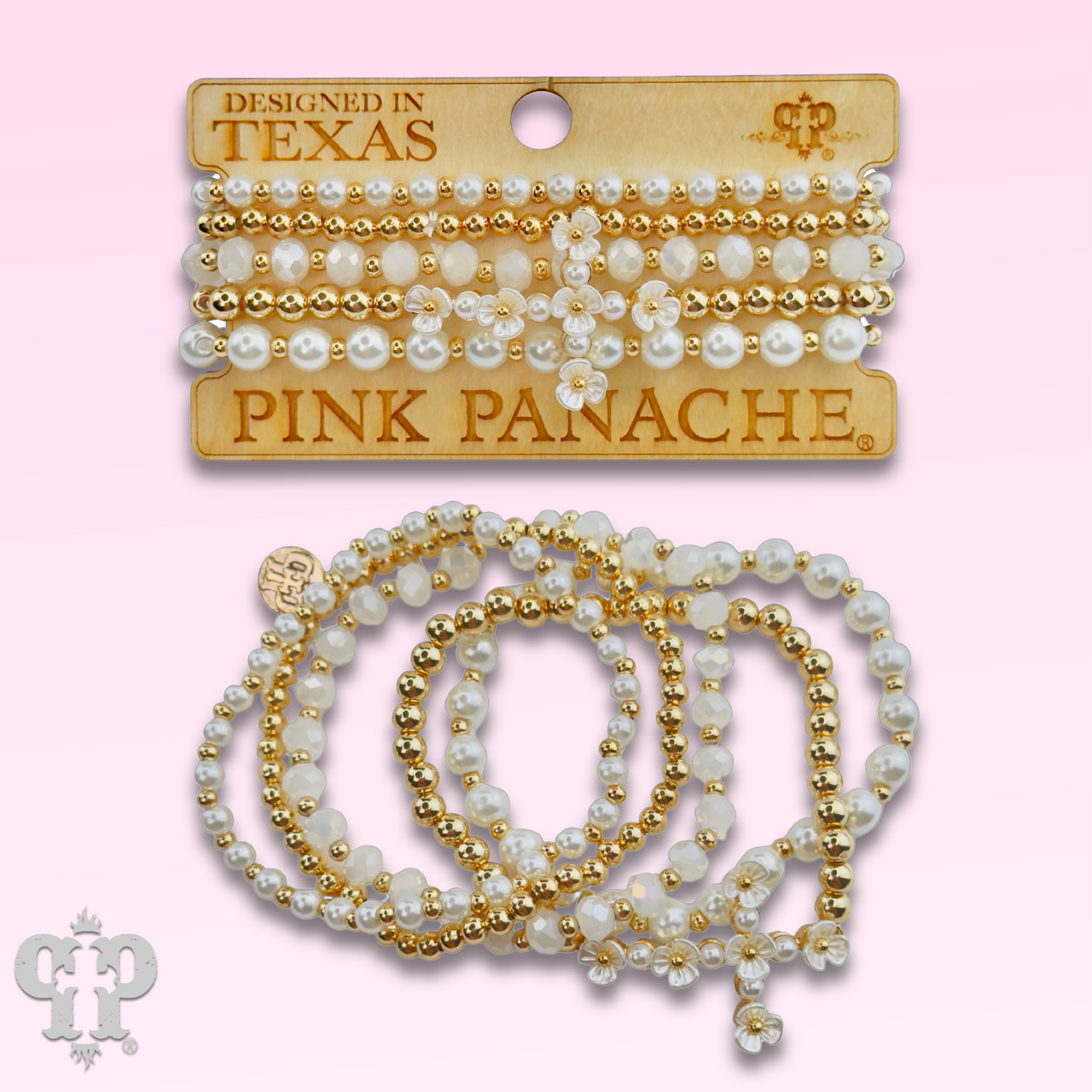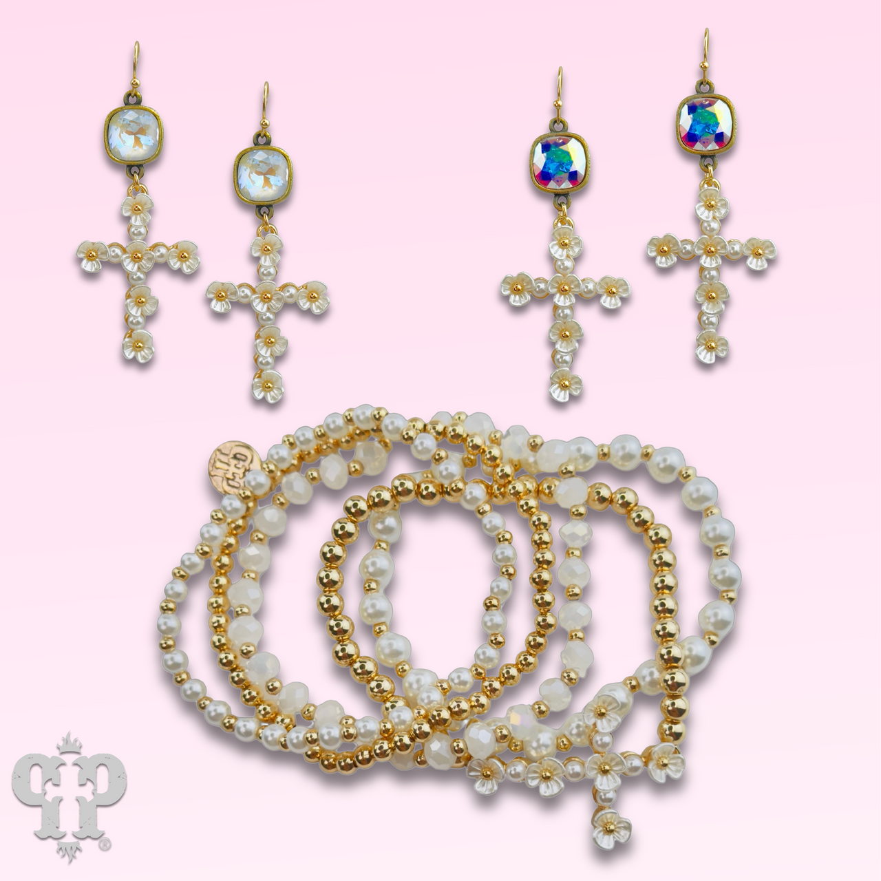 This bracelet set has five strands of acrylic pearl and gold tone beads. The featured charm is a cross with little pearlized flowers.