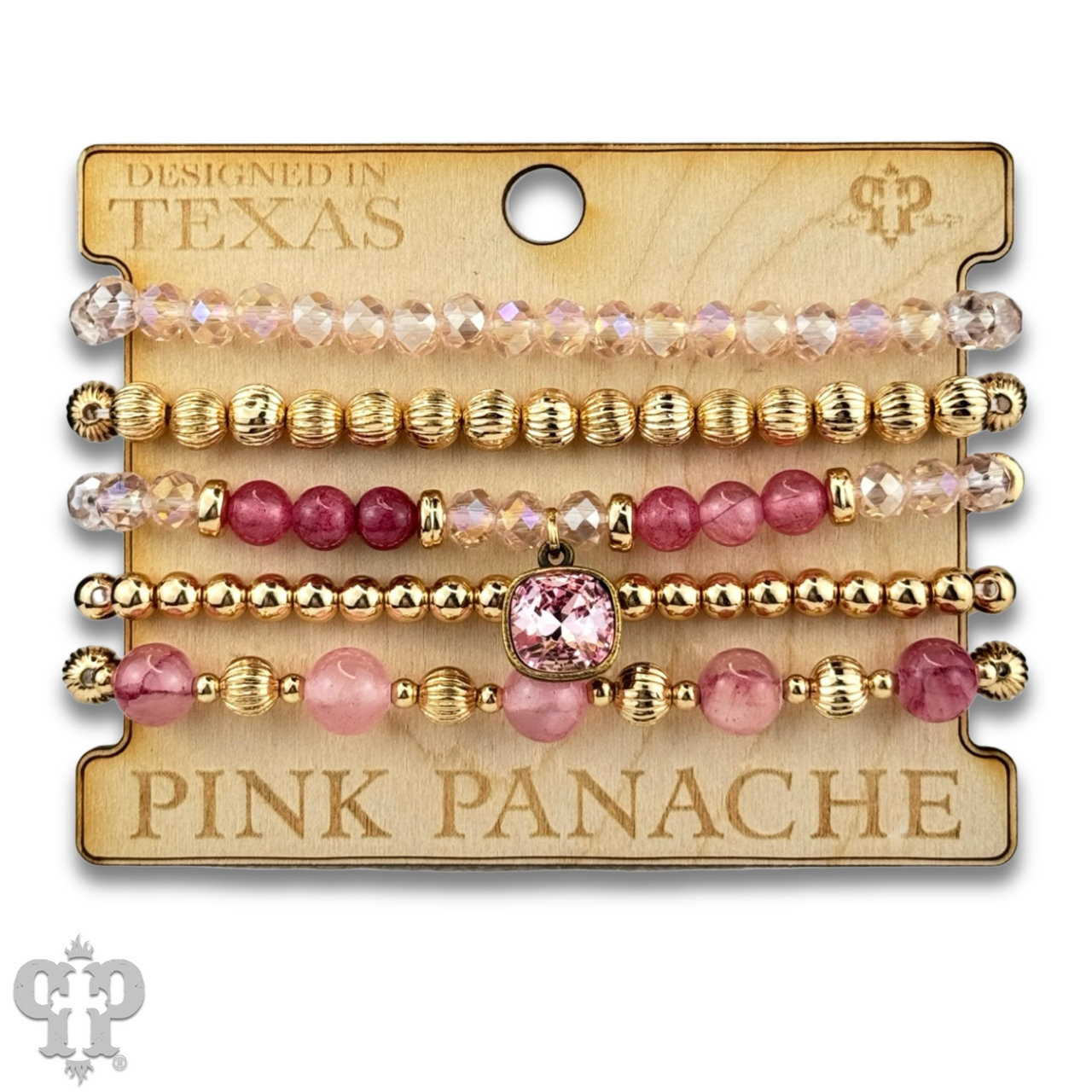 This bracelet set has five strands of smooth and fluted gold tone beads with colorful glass beads mixed in. The feature is a 10mm Austrian crystal in a setting custom made for Pink Panache. It stretches for ease of wear and one size fits most.