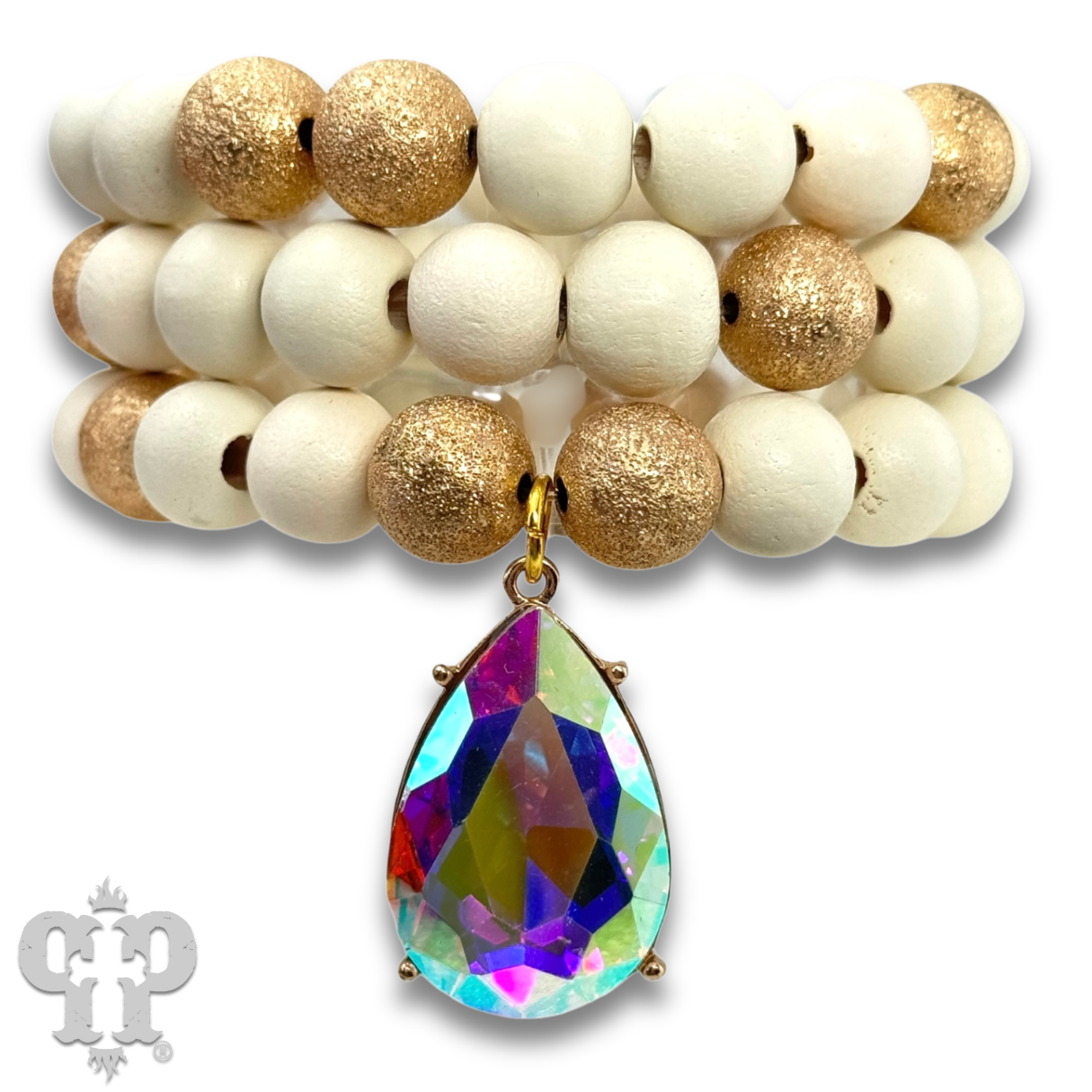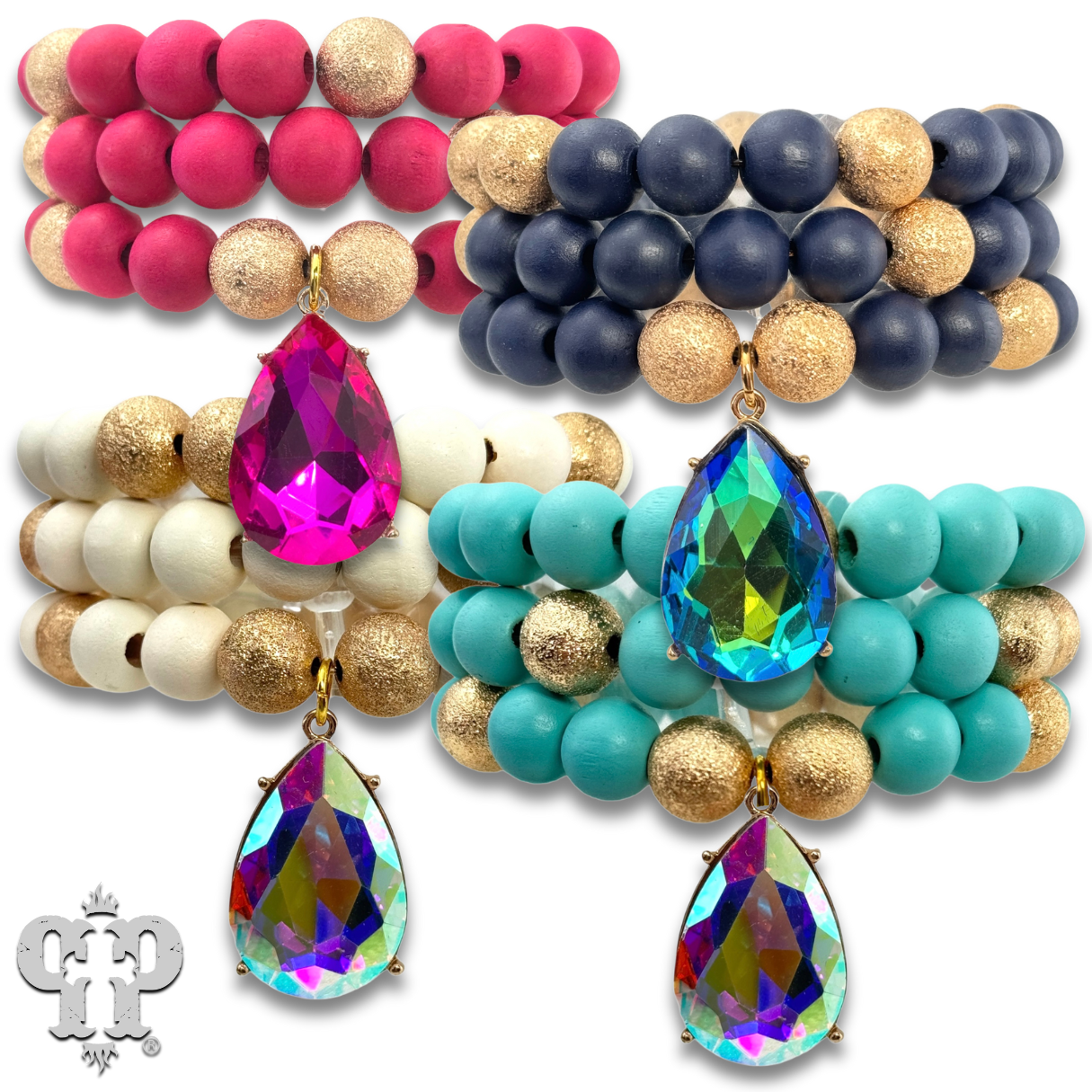 This bracelet boasts three strands of large round wood and gold tone foil texture beads. Adorned with a sparkling rhinestone teardrop charm, it easily stretches on and off for effortless style.
