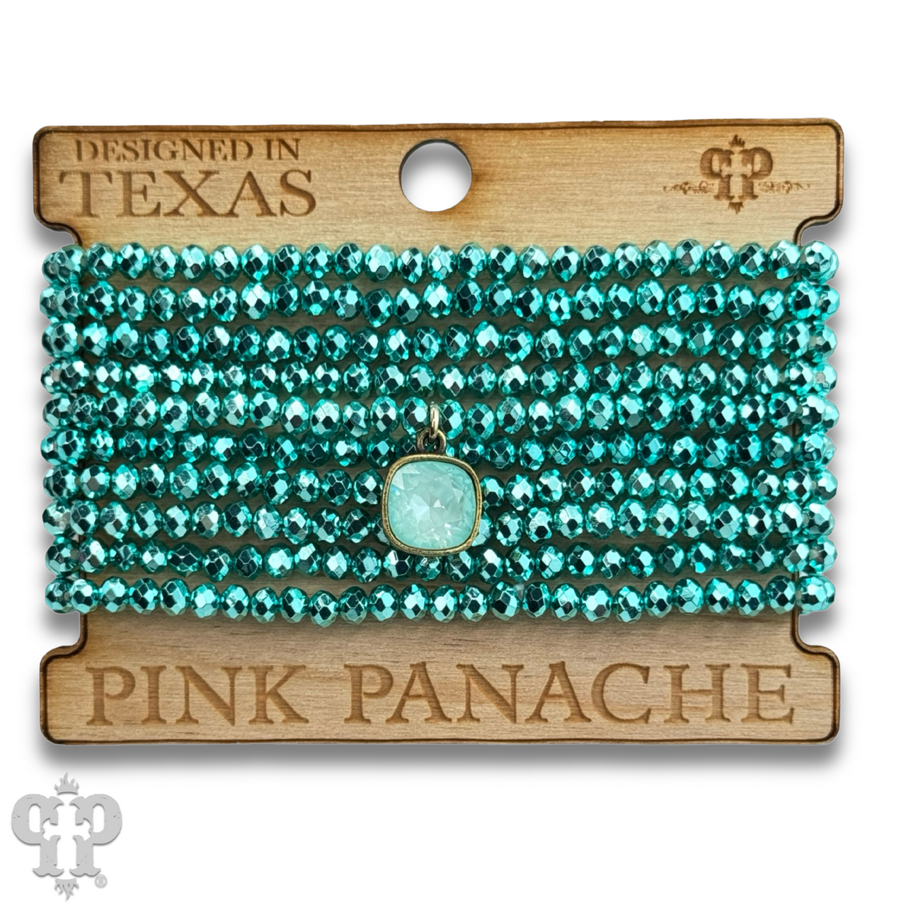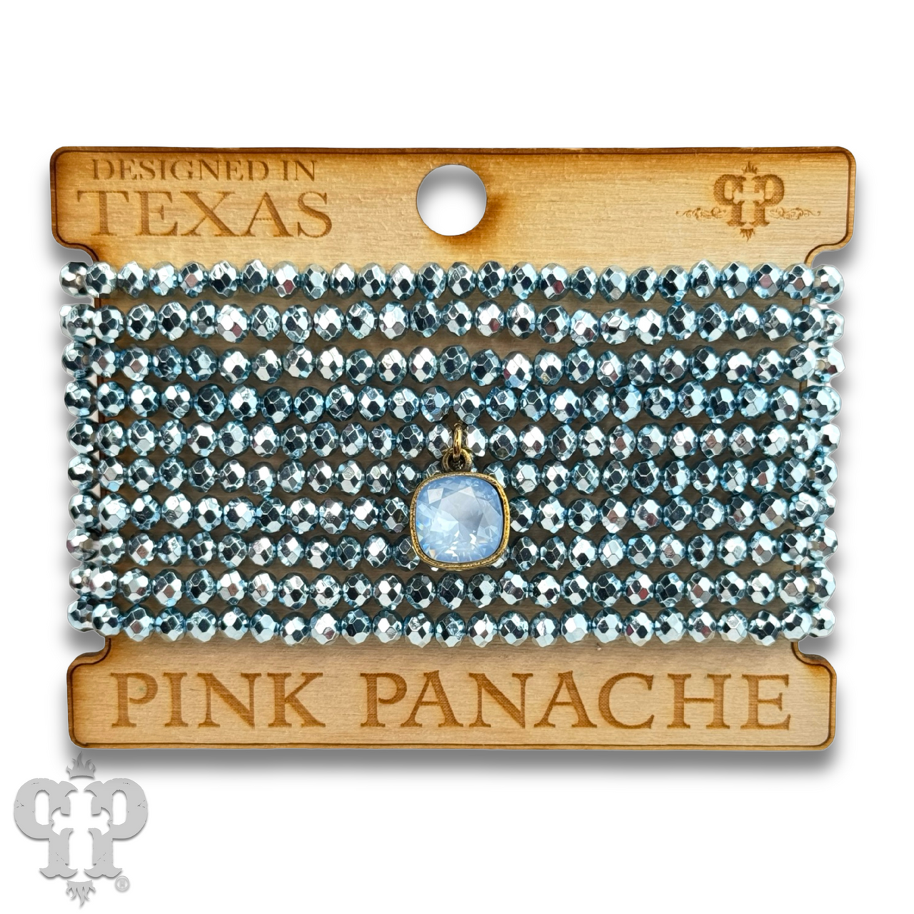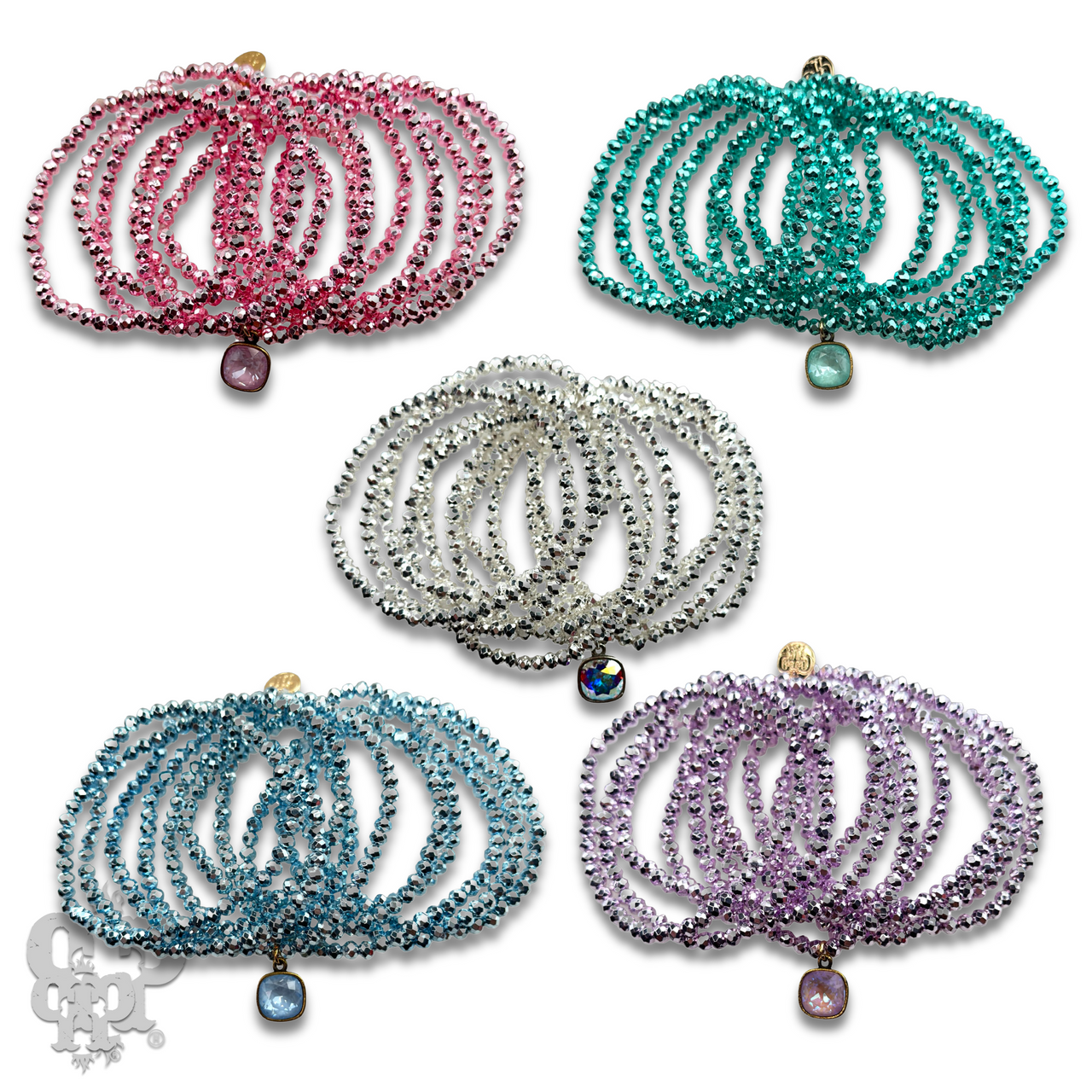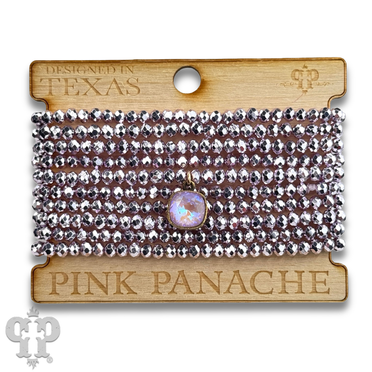 This bracelet set has 10 strands of faceted metallic finish beads. The charm is a 10mm Austrian crystal in a setting custom made for Pink Panache in the USA.