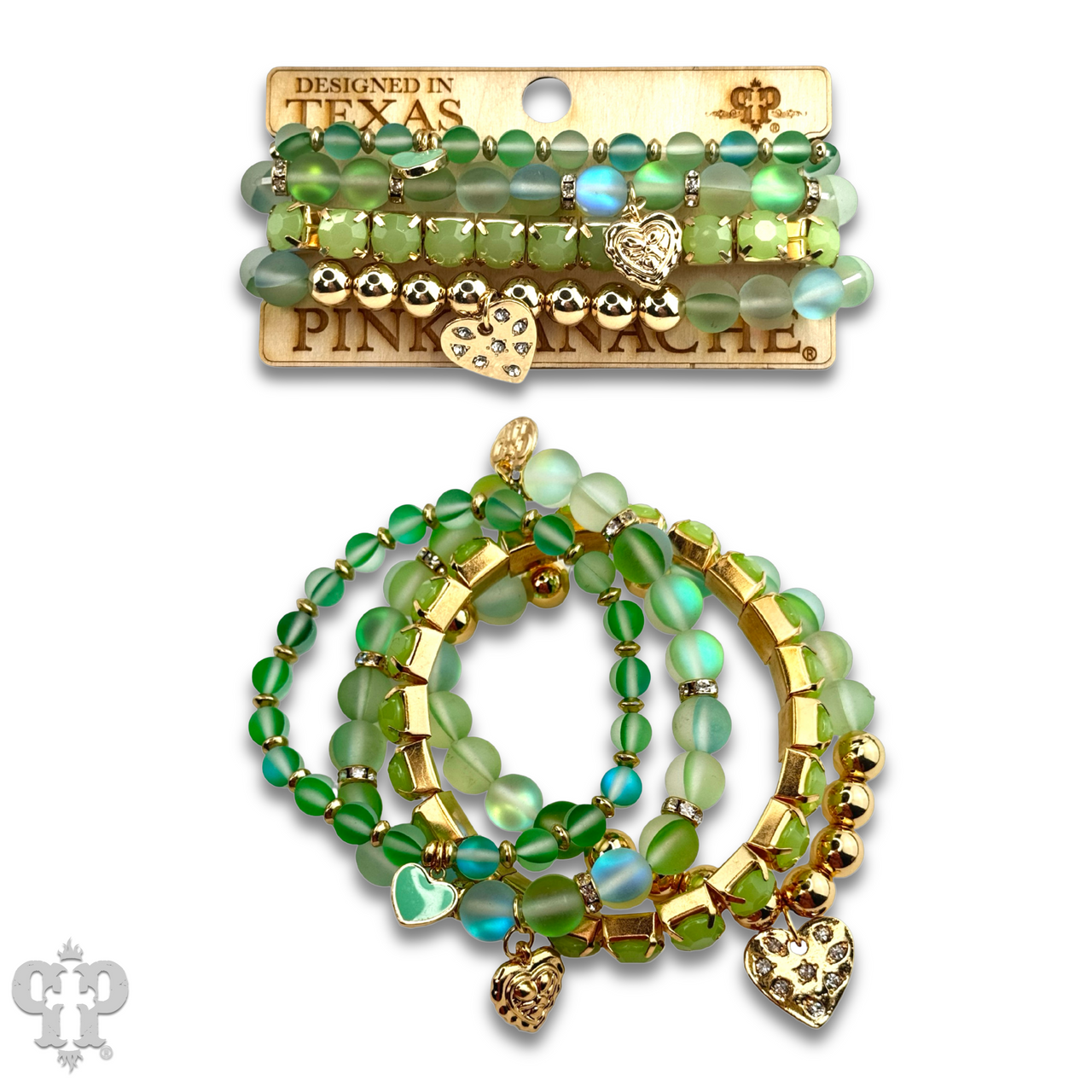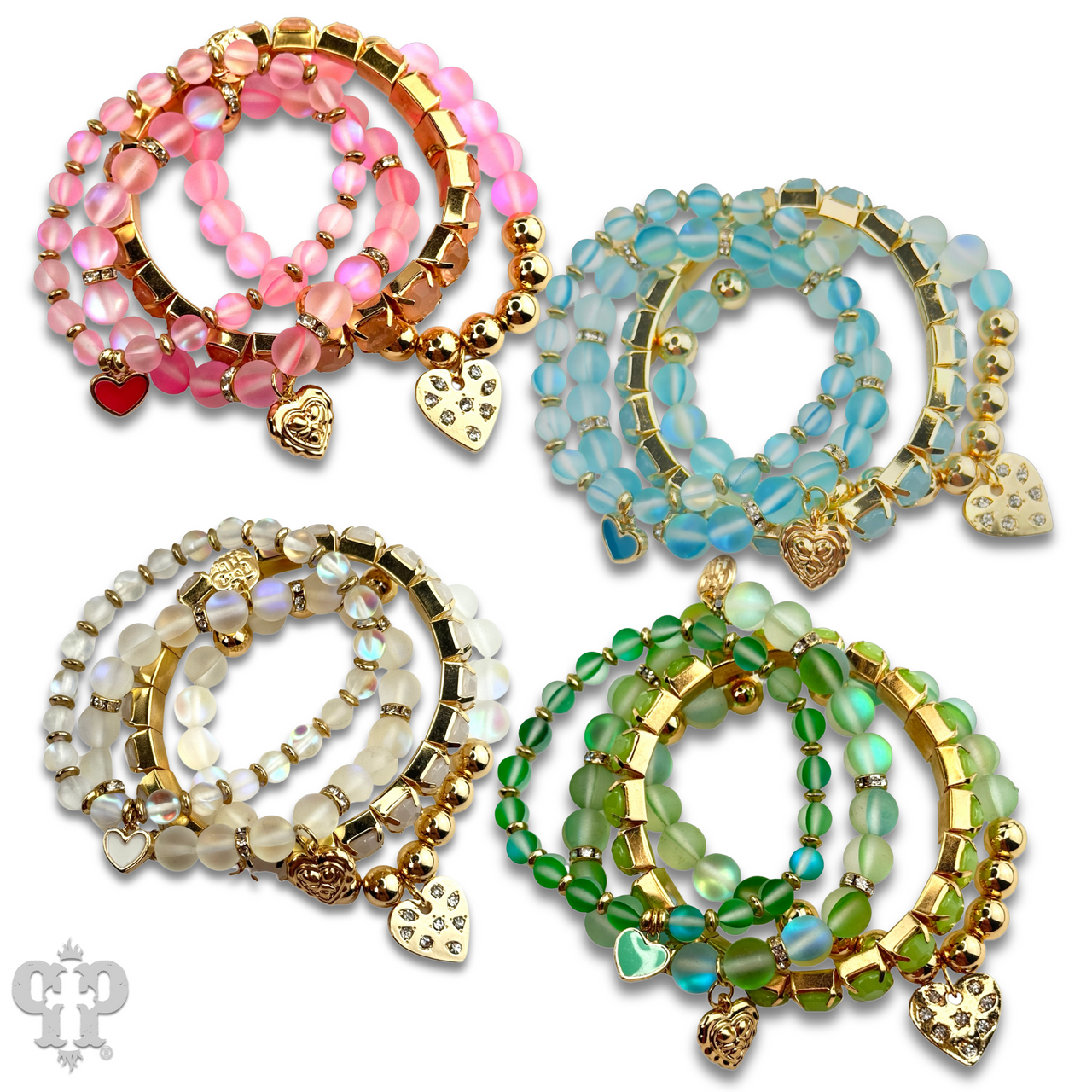 This bracelet set has four strands of mixed beads including one strand of prong set rhinestones. The charms are hearts in a variety of styles, the largest has inset rhinestones.