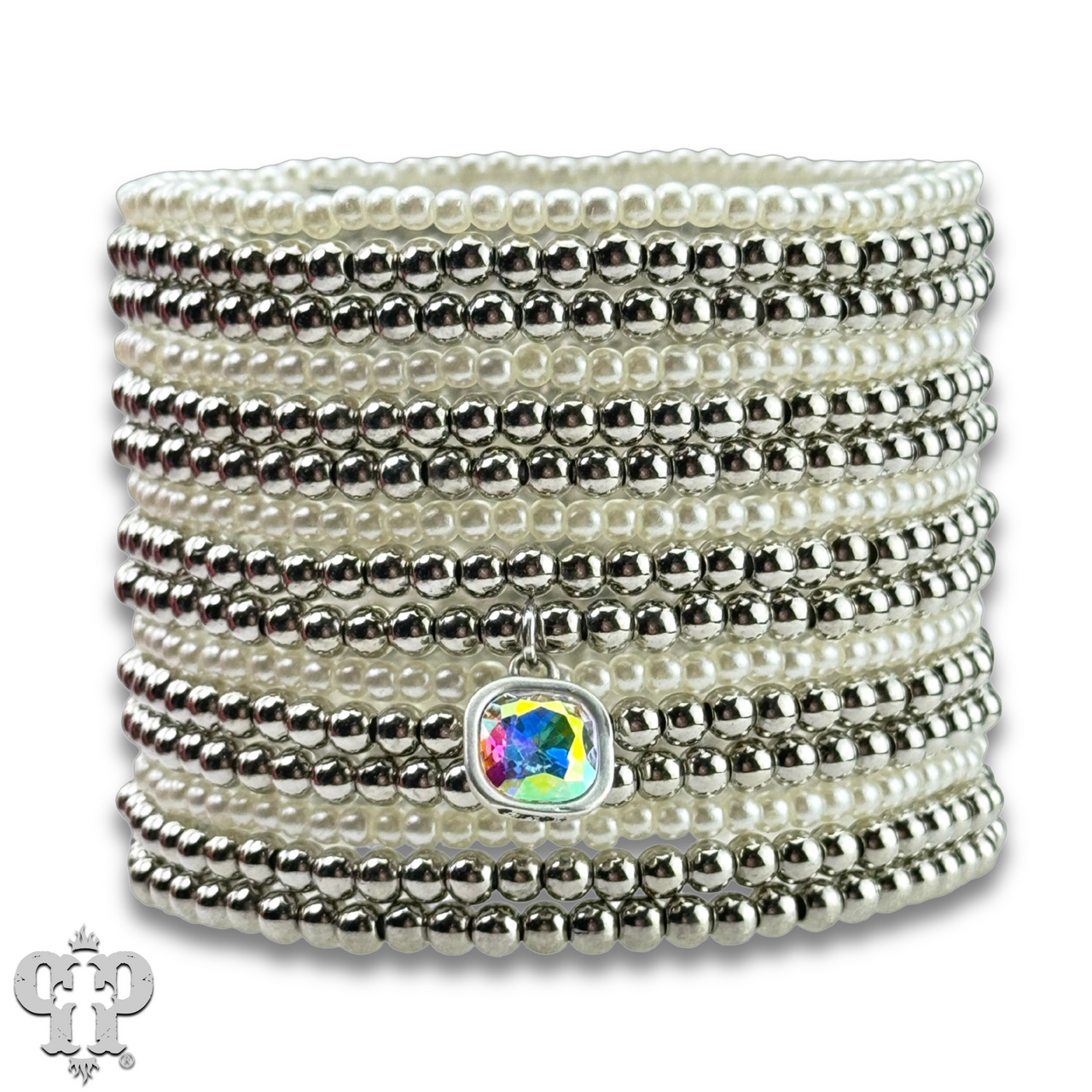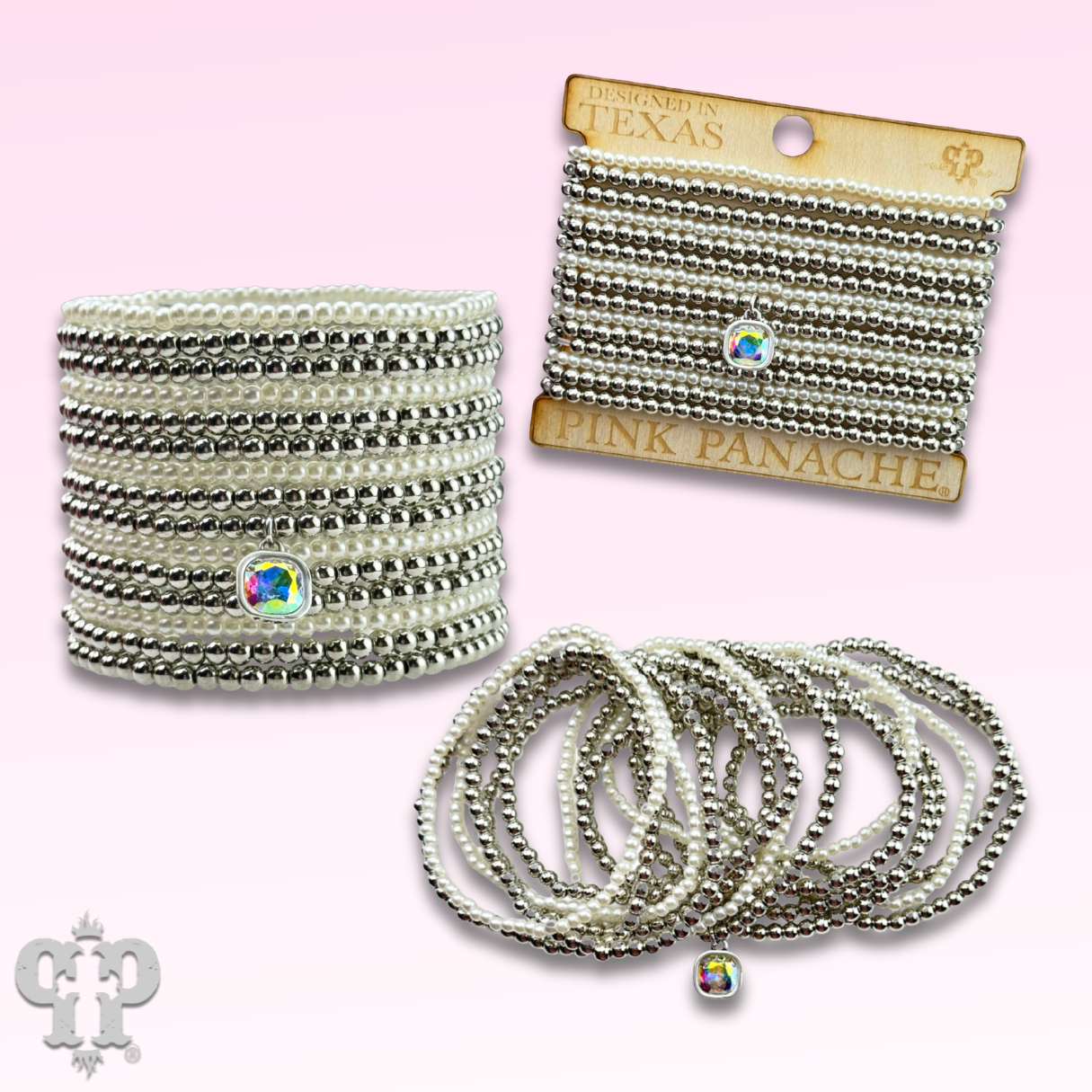 These bracelets have 15 strands of metal tone and pearl color beads.  The bracelet feature is an iridescent (AB) Austrian crystal in a setting custom made for Pink Panache in the USA.  The bracelet stretches for ease of wear.