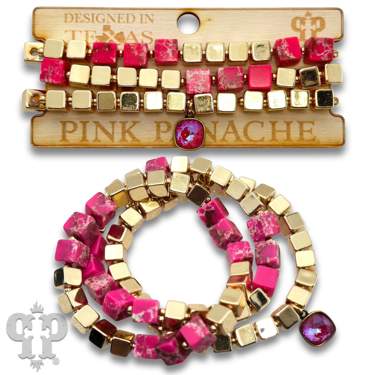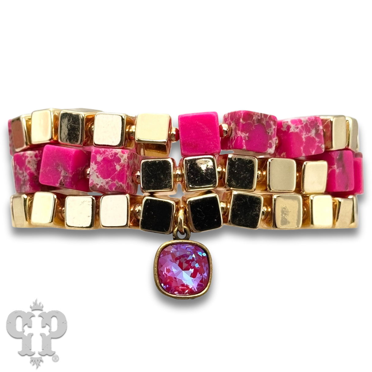 This bracelet features three strands of square stone and gold tone beads. The charm is an Austrian crystal drop.