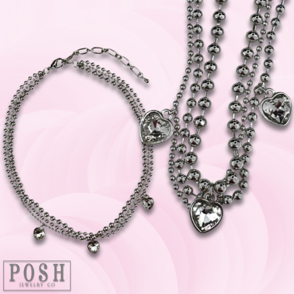 This necklace has three strands of bead chain in varying sizes. Each strand has a rhinestone heart charm and provides a great layered look.
