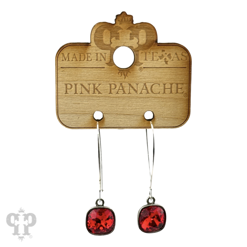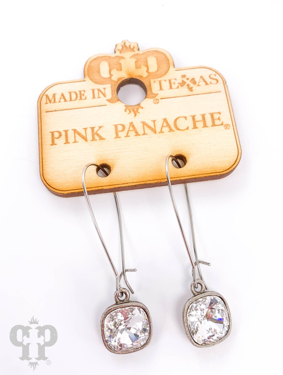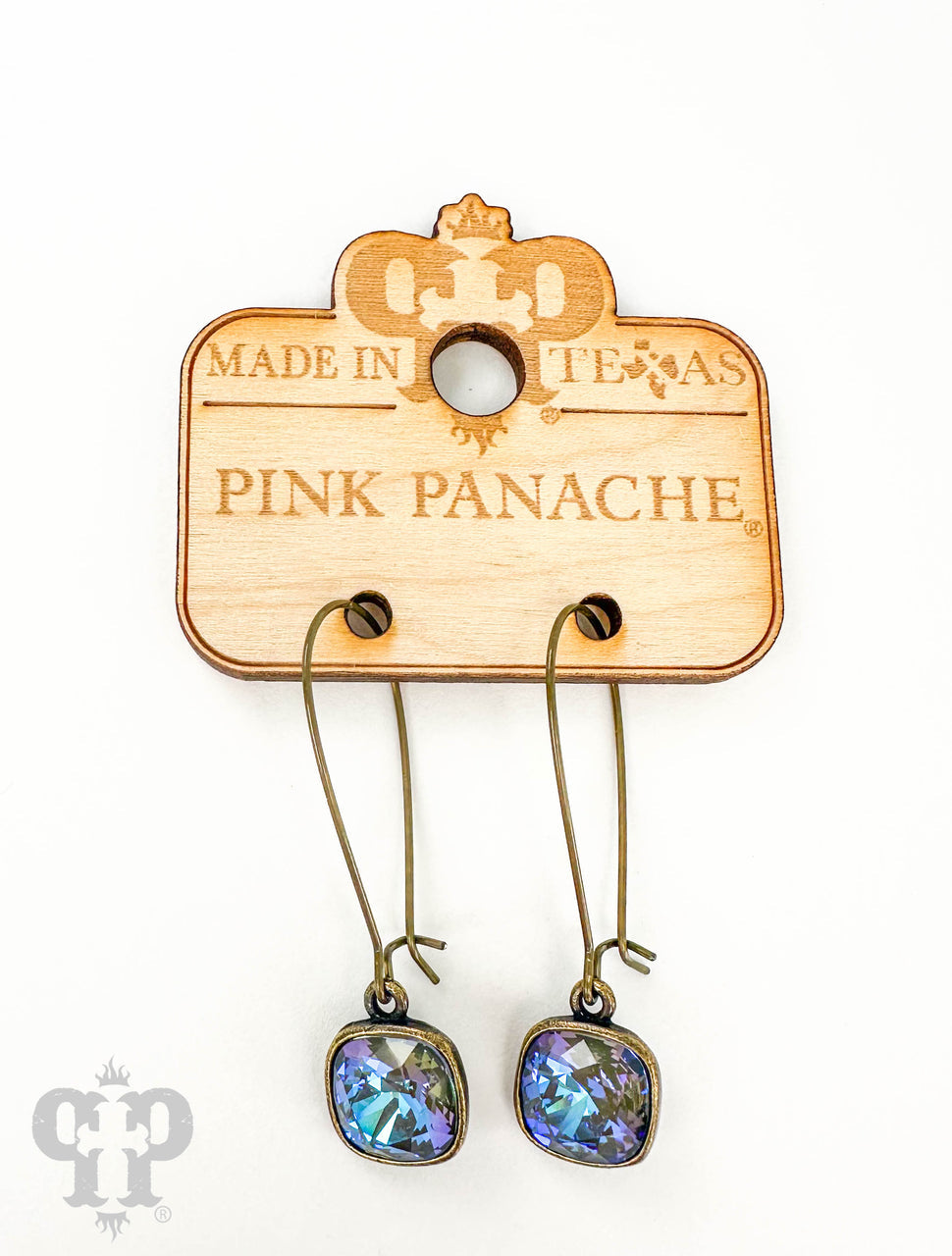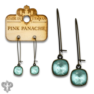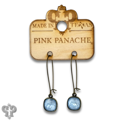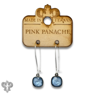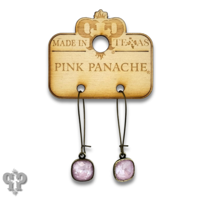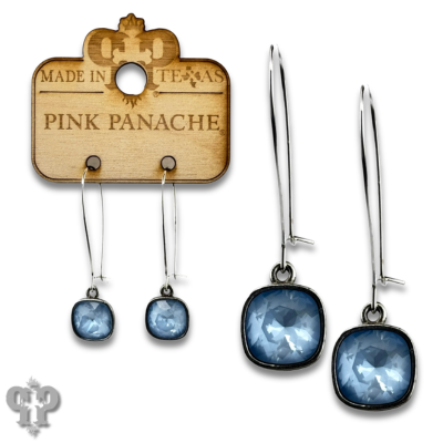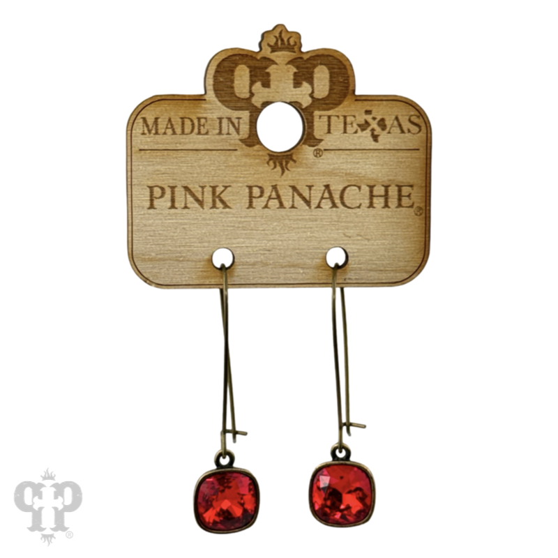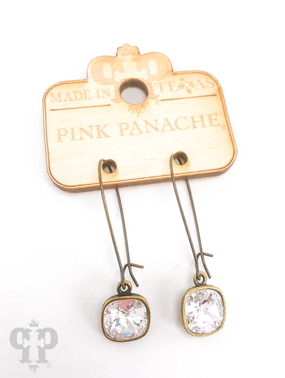 This kidney wire earring features a 10mm Austrian crystal stone. The stone is in a brass plated setting that was custom made for Pink Panache in the USA. 10mm is approximately .4 inches. The earring is approximately 1.75 inches in total length.