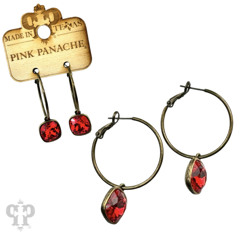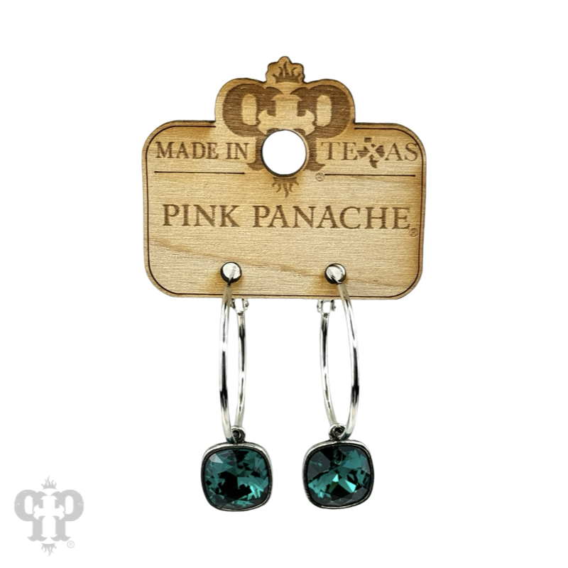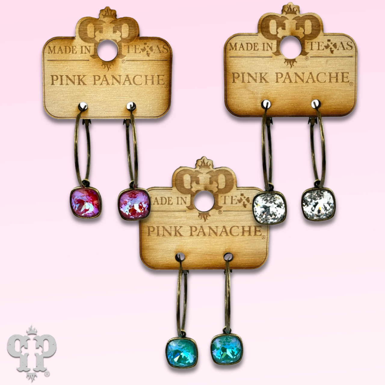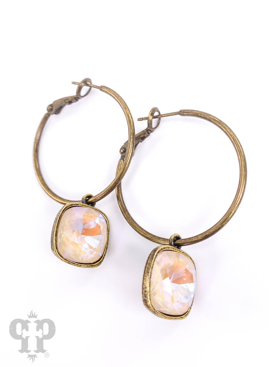 This medium hoop earring features a 12mm Austrian crystal stone. The stone is in a brass plated setting that was custom made for Pink Panache. 12mm is approximately .5 inches The earring is approximately 2 inches in total length. Hoop has a flip latch closure.