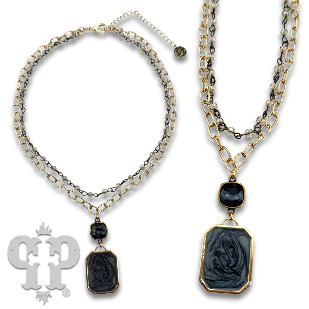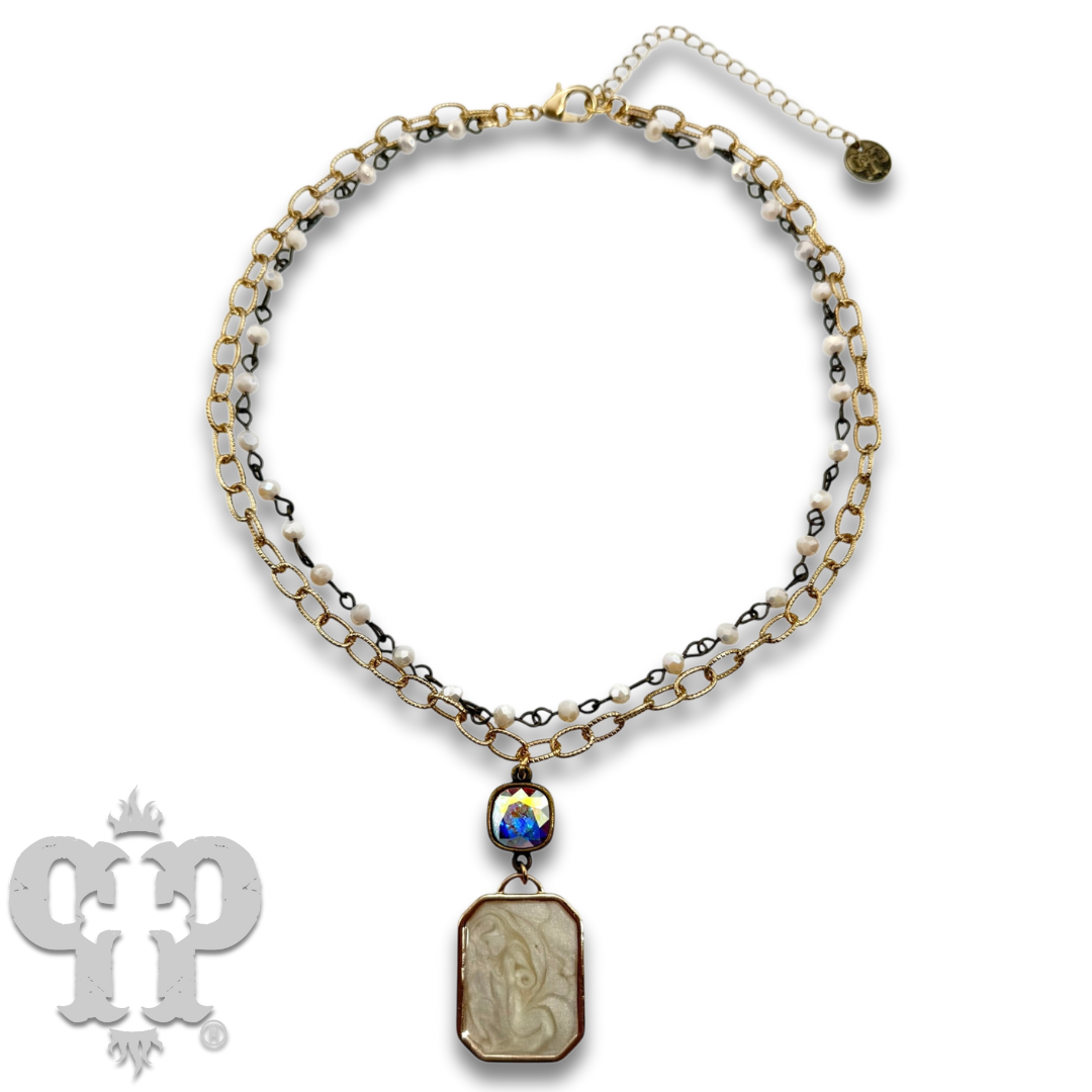 A refined double strand design defines this necklace, pairing a textured gold tone chain with an delicate strand of faceted beads. The focal point—a pearlescent rectangular pendant with a radiant 10mm Austrian crystal from a bespoke setting crafted exclusively for Pink Panache. This harmonious blend of materials creates a piece that transcends trends, offering a classic look for the discerning wearer who appreciates timeless appeal.