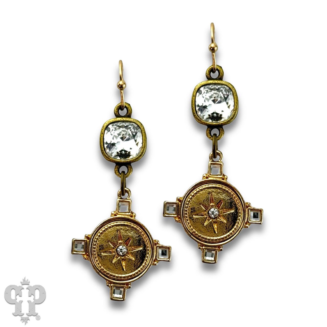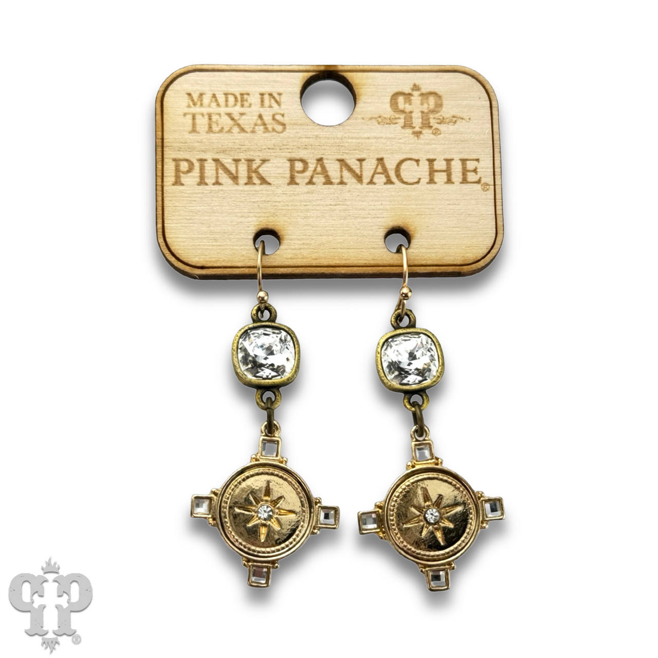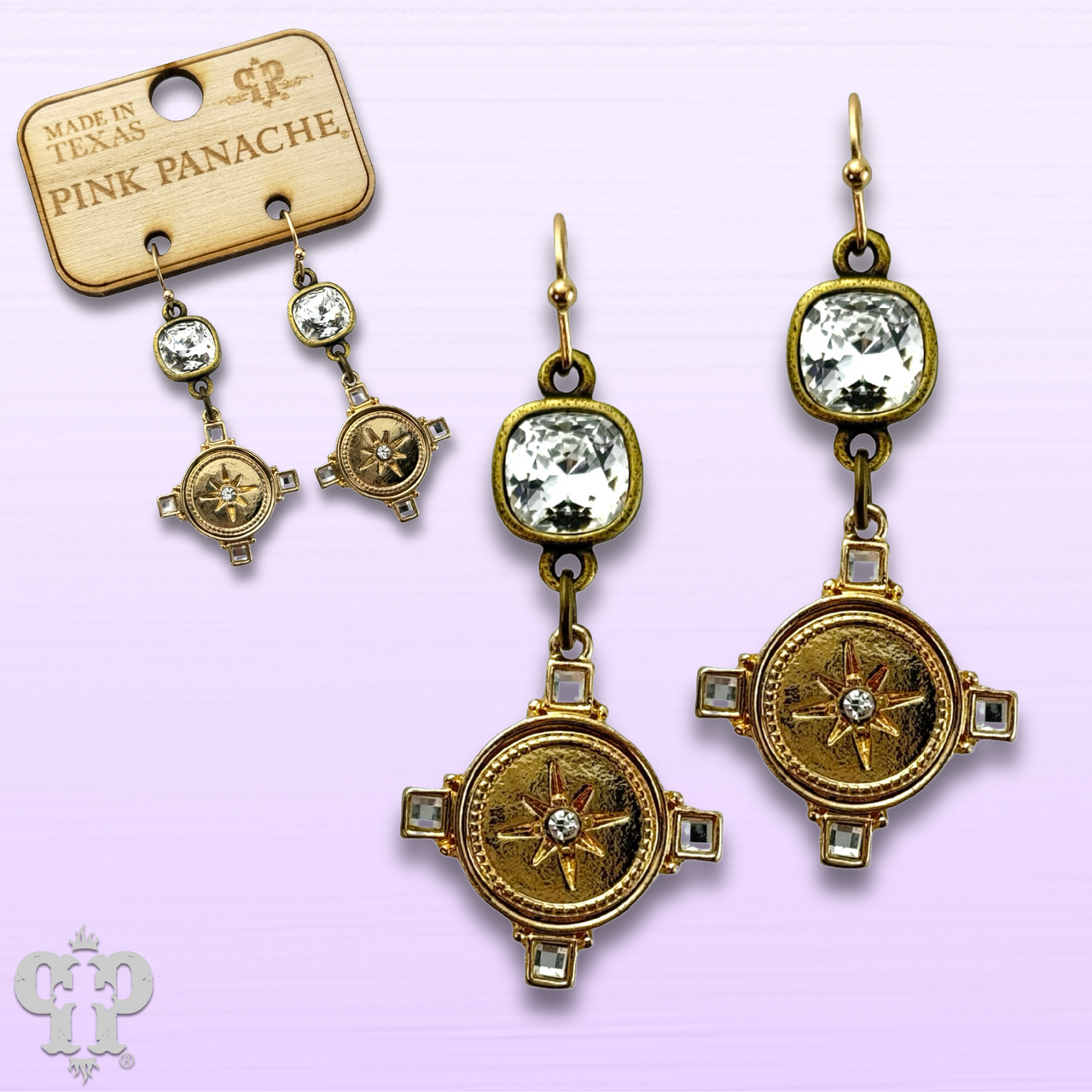 These earrings have a gold tone starburst stamped round charm.  They hang from an 8mm clear Austrian crystal in a setting custom made for Pink Panache in the USA.