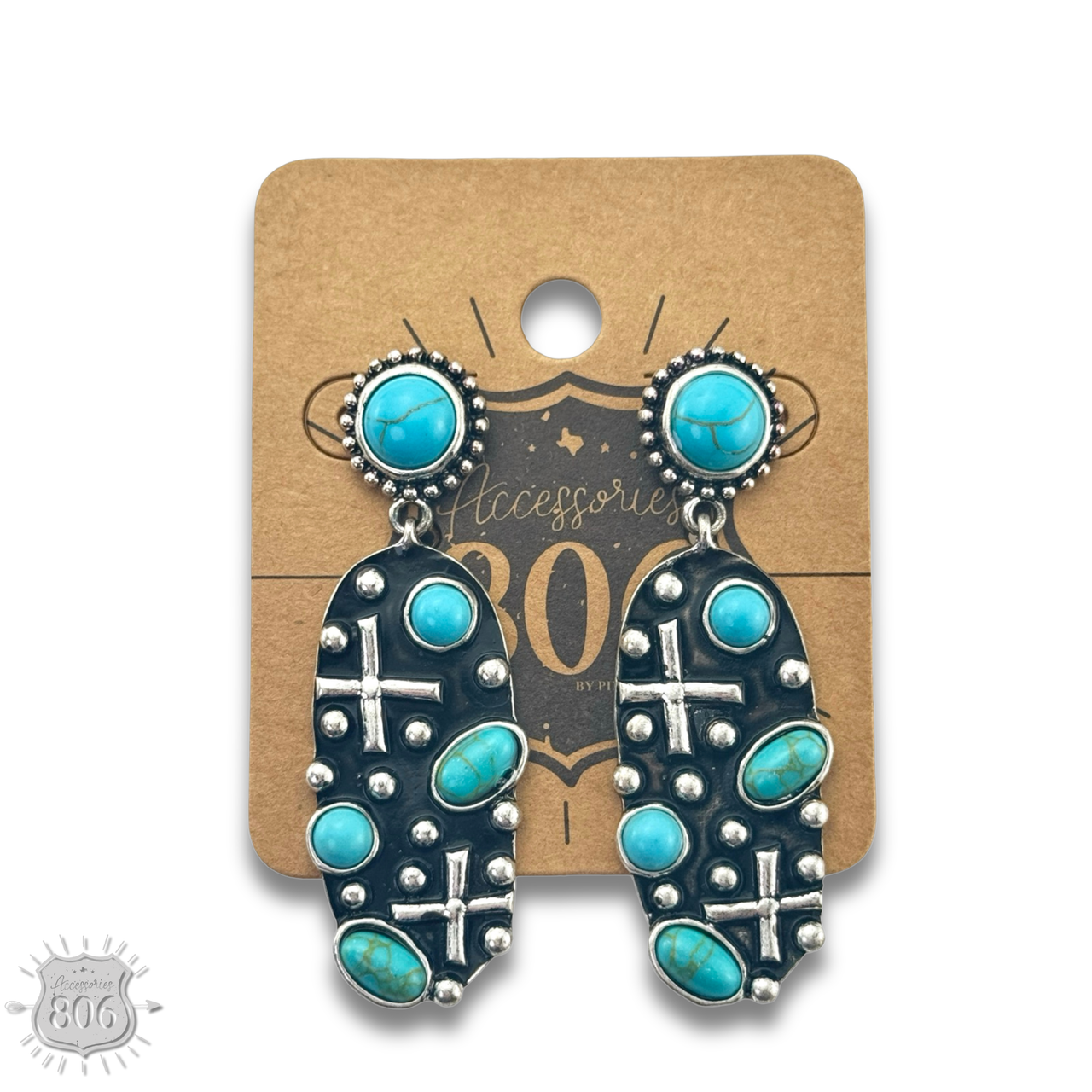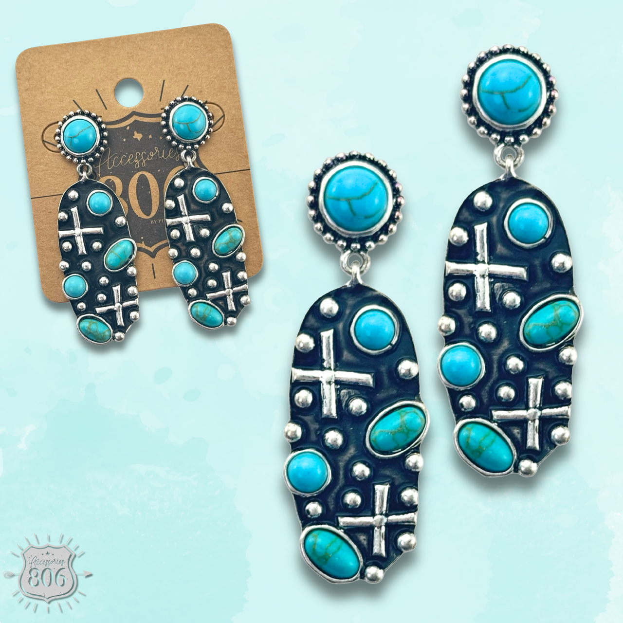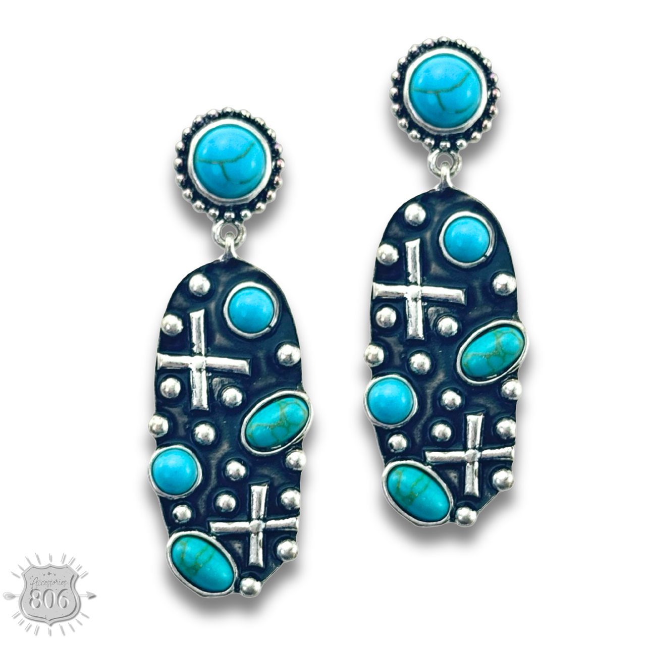 Aged look oval earring with turquoise color stones on a turquoise stone post setting. Approximately 2 inches in length.