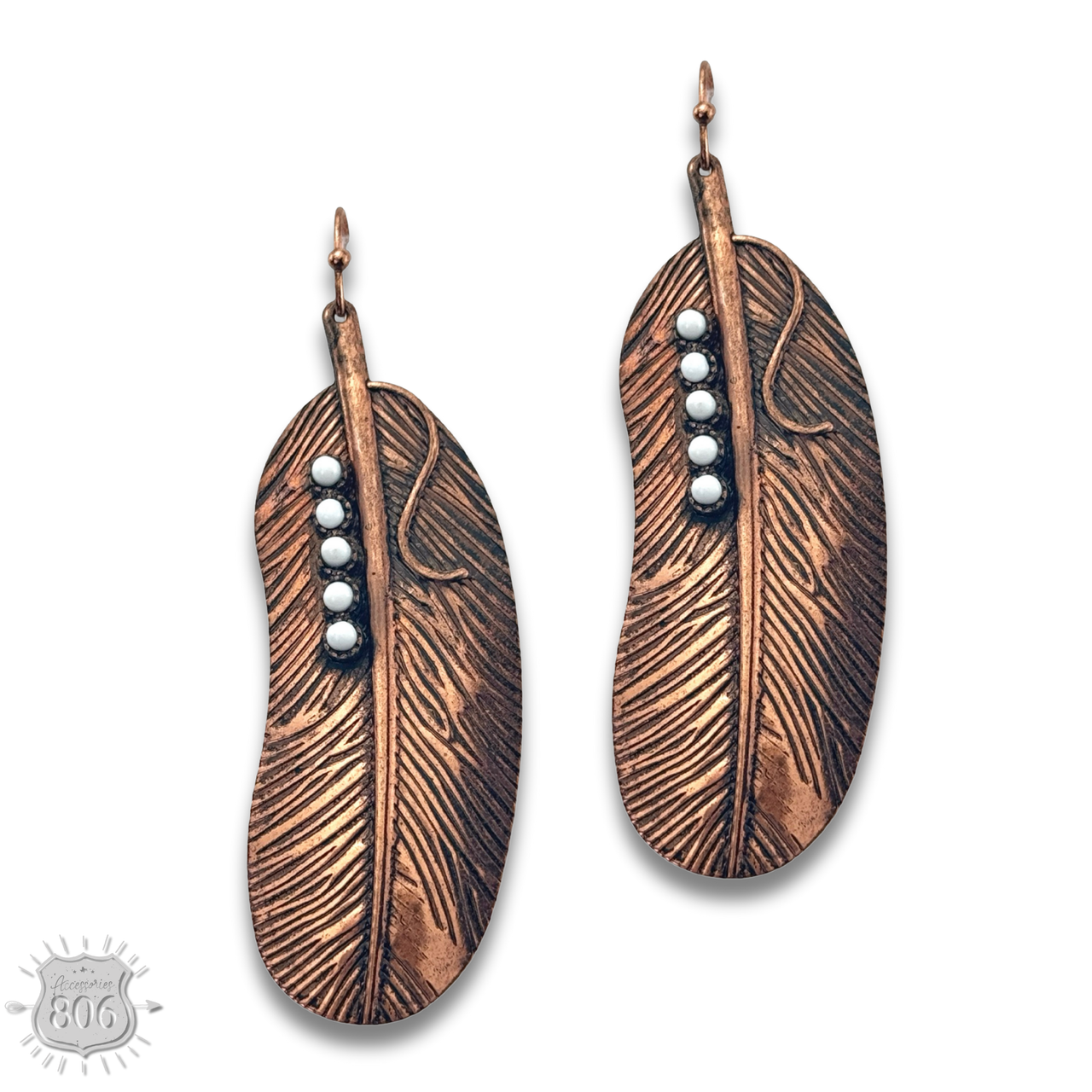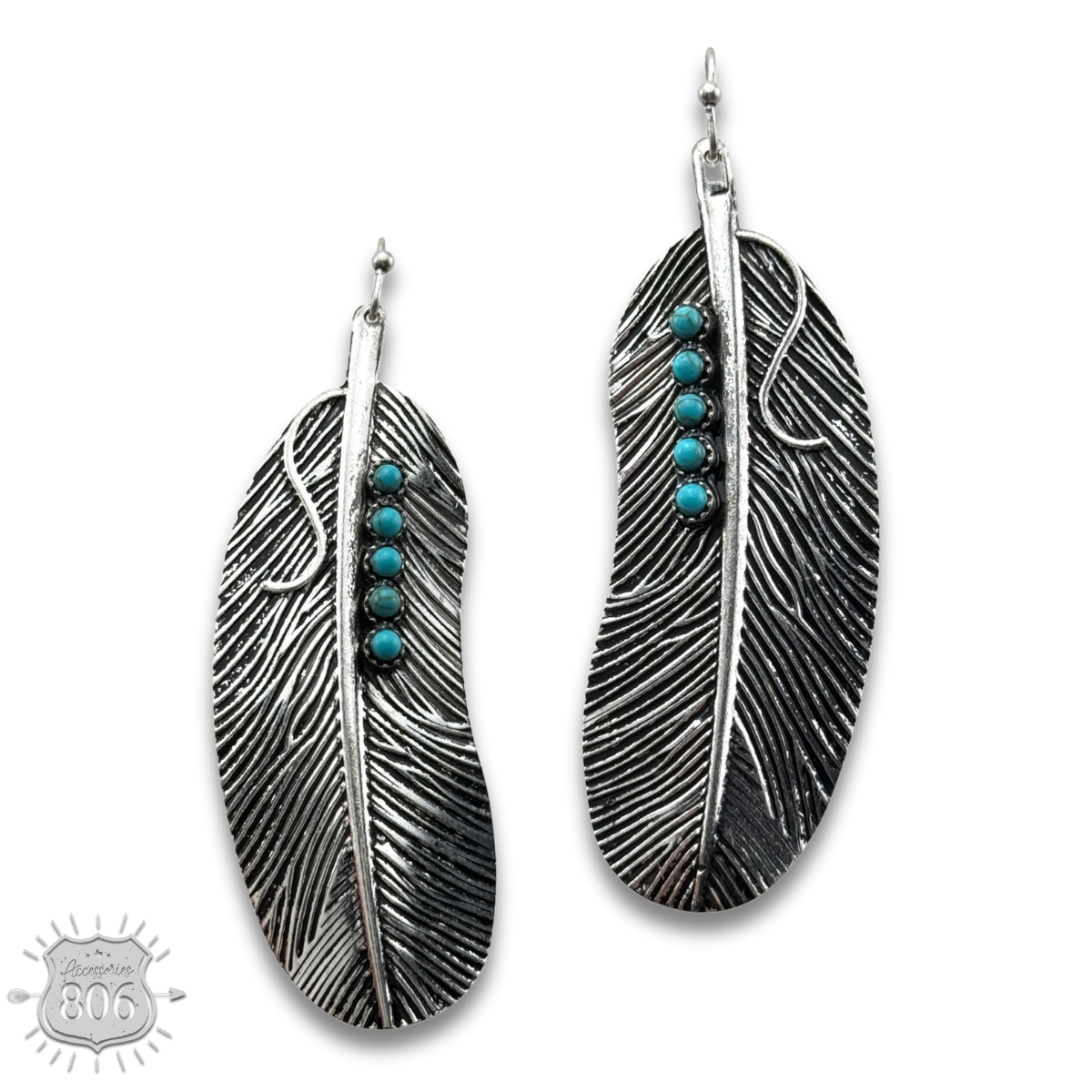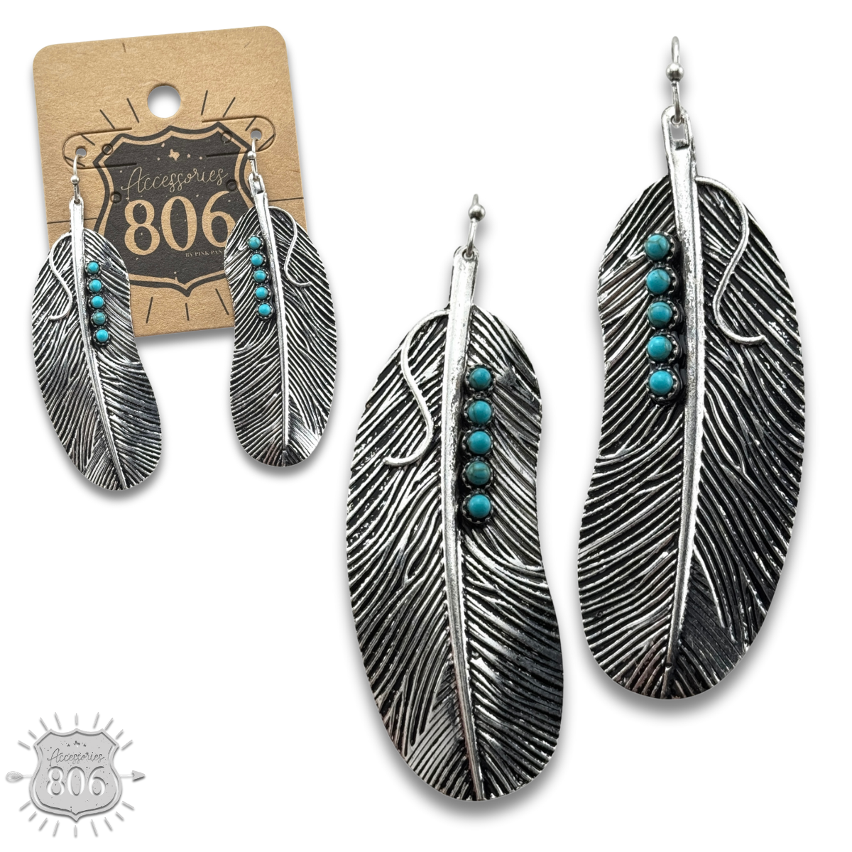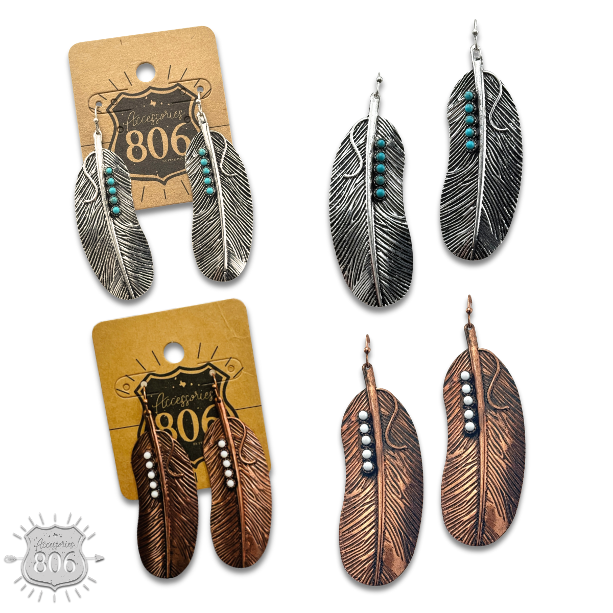 These etched look feather shape earrings have tiny stone accents on a french hook. Approximately 2 inches in length.