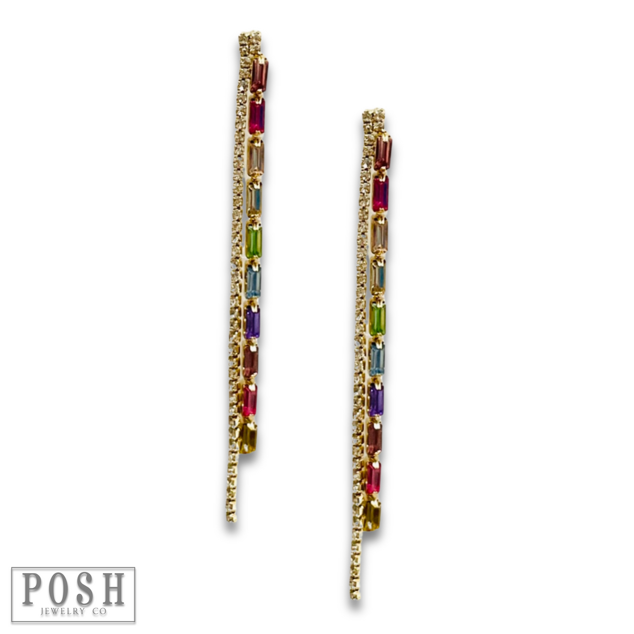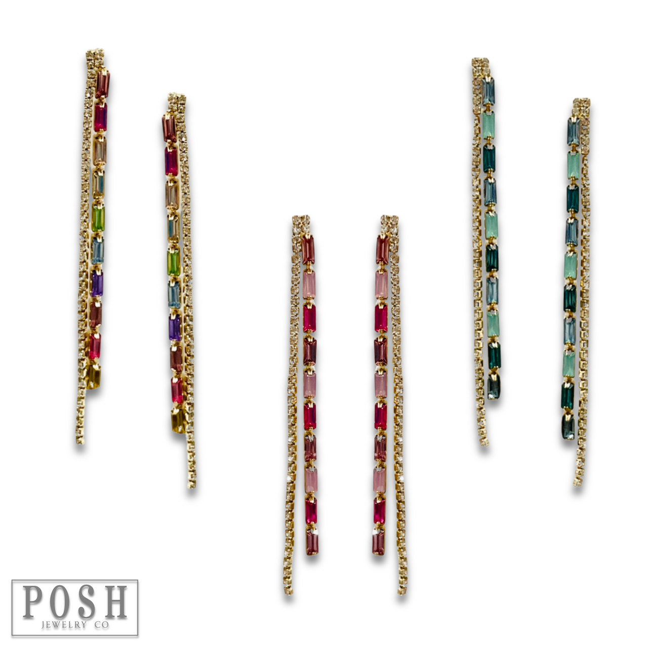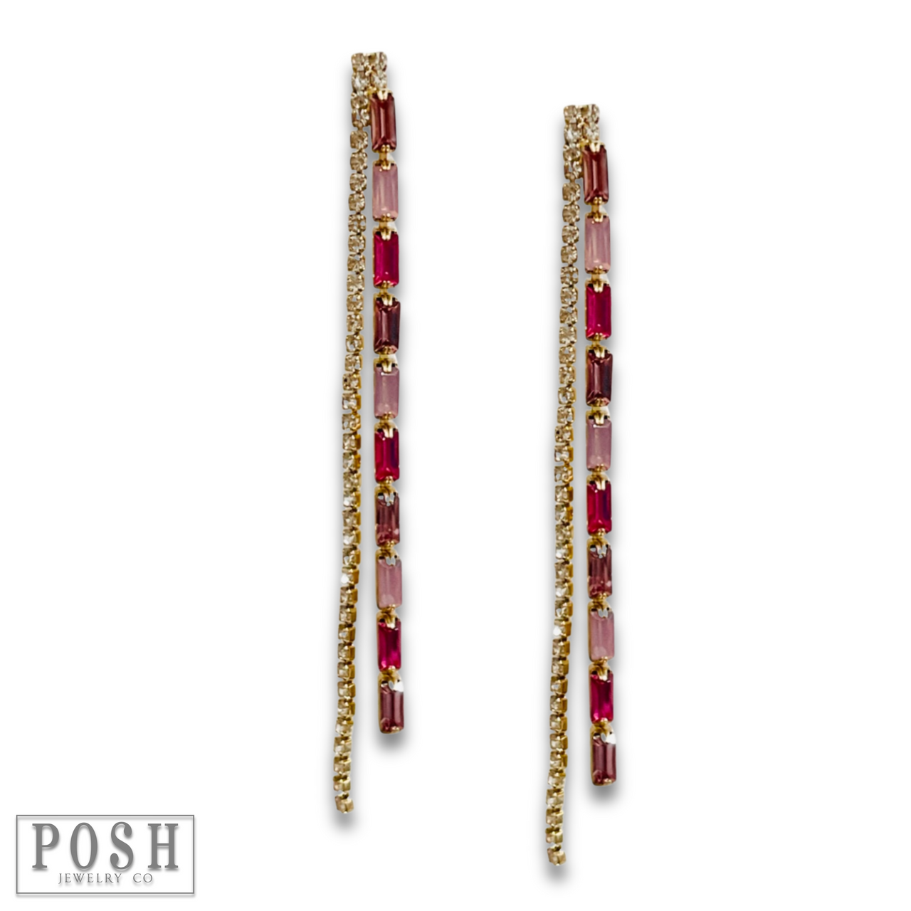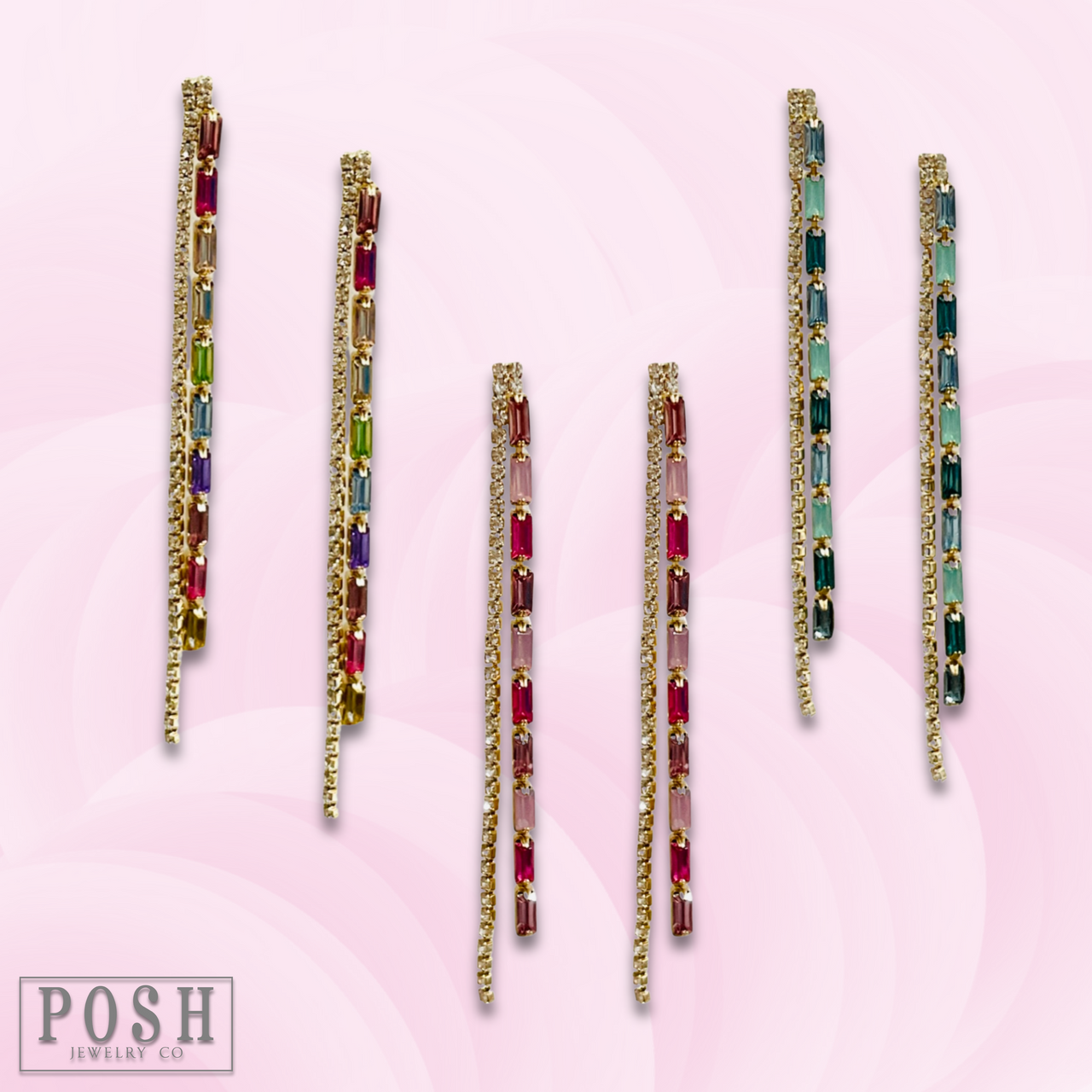 Spice up your ear game with these playful fringe earrings! Featuring a row of rectangular rhinestones and a strand of chain, they add a touch of charm to any outfit.