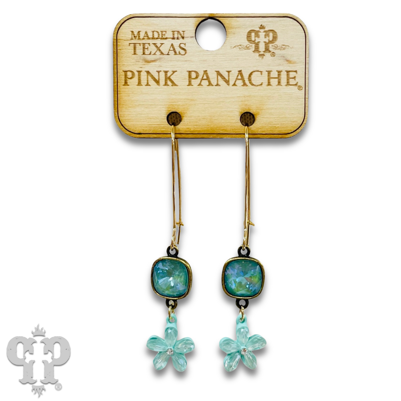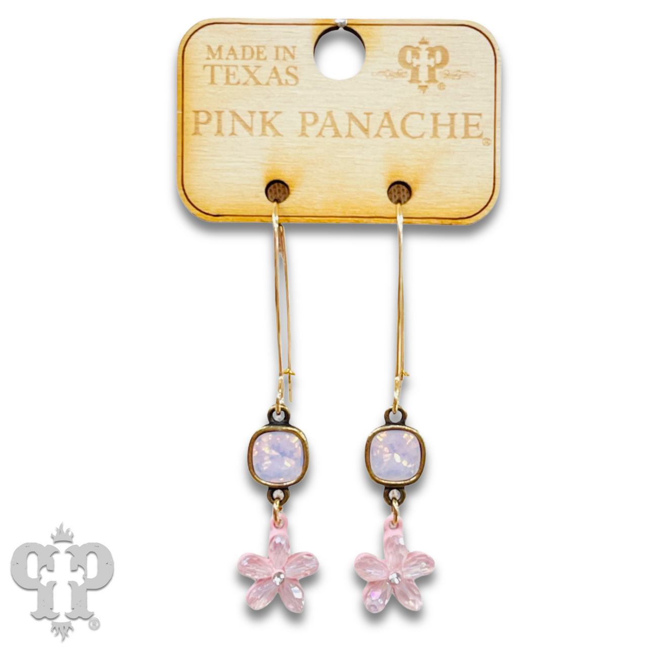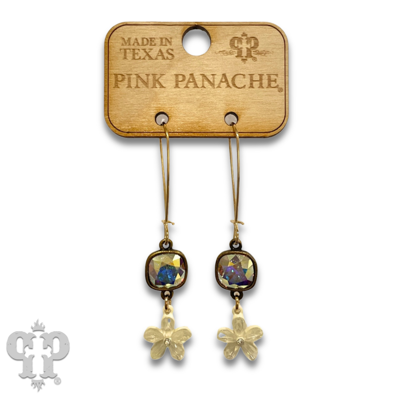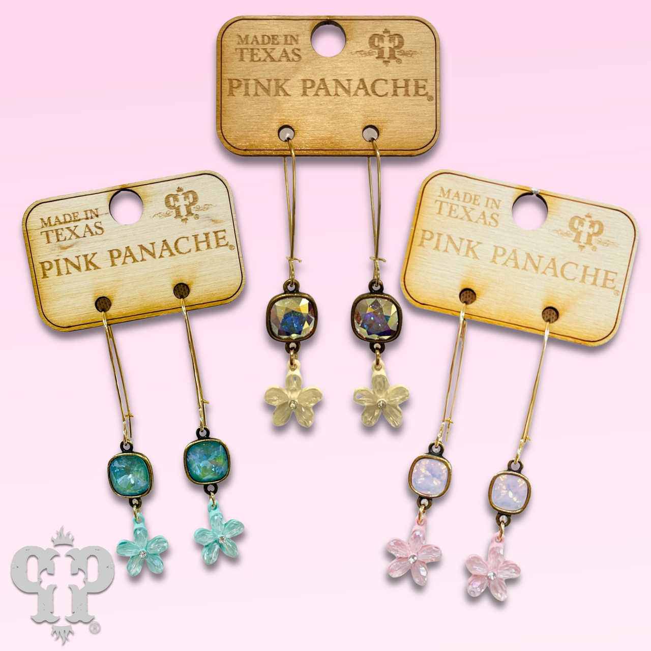 The delicate glass flower charm earring combined with an Austrian crystal, in a setting custom made for Pink Panache in the USA, offers a pop of spring pastel.